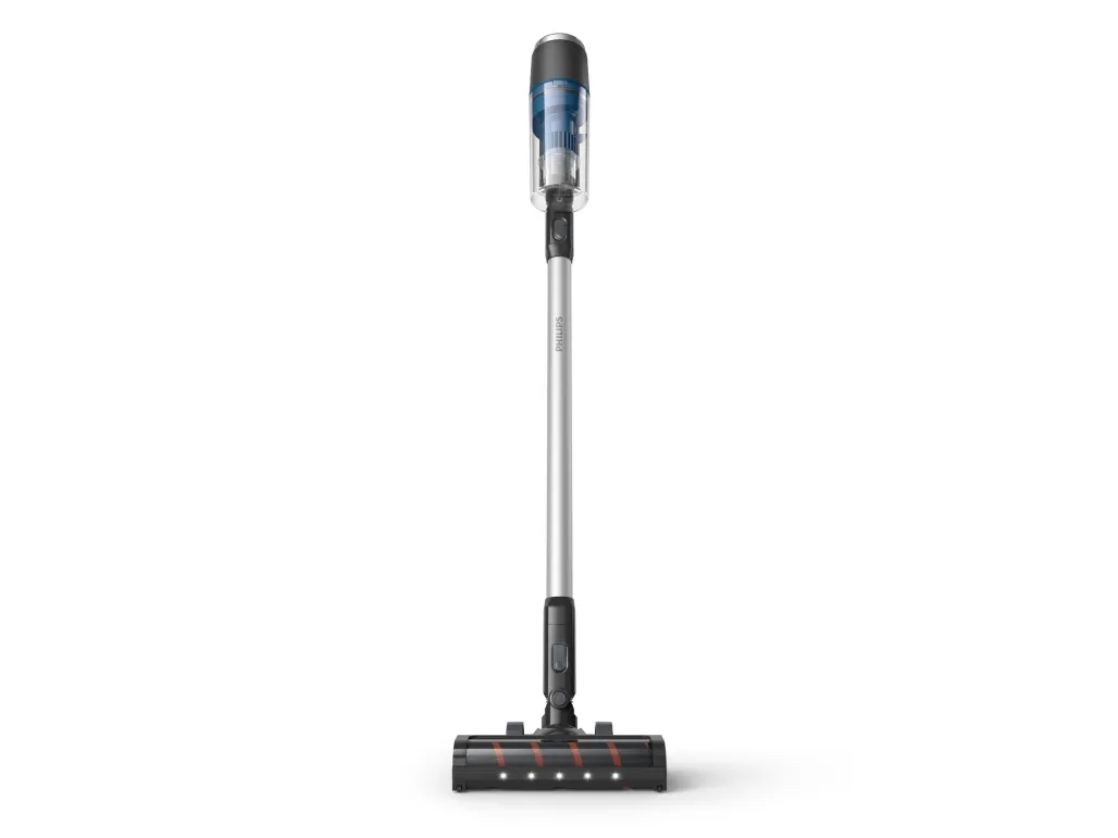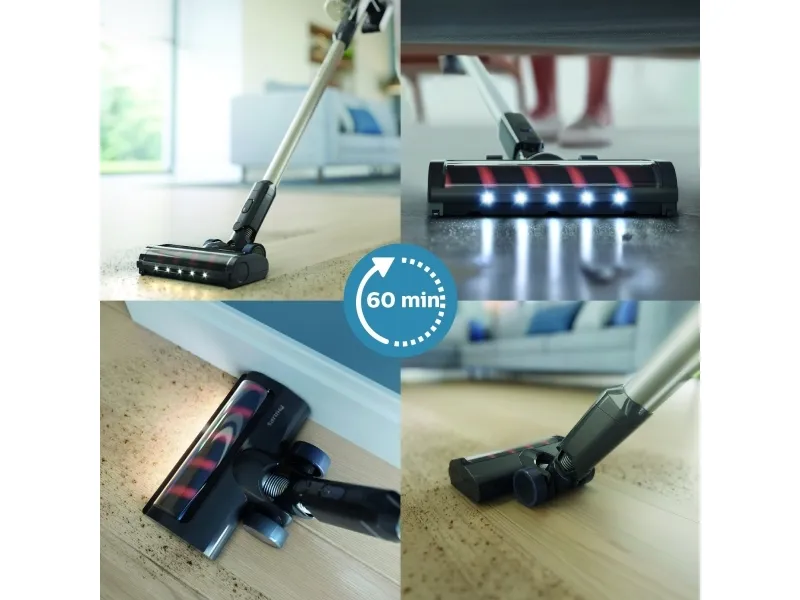 The Philips 3000 Series XC3032 is designed for versatile cleaning with its bagless and cyclonic technology approach. This vacuum cleaner operates both as a stick and handheld unit, providing flexibility for various cleaning tasks. It features an ultrafine filter with three levels of filtration, ensuring that dust and allergens are effectively captured. With a powerful lithium-ion battery, it offers a runtime of up to 60 minutes per charge, allowing extended use on a full charge time of 5 hr. The included accessories, such as a crevice nozzle and LED floor brush, enhance effectiveness in reaching tight spaces and illuminating dark areas while cleaning.