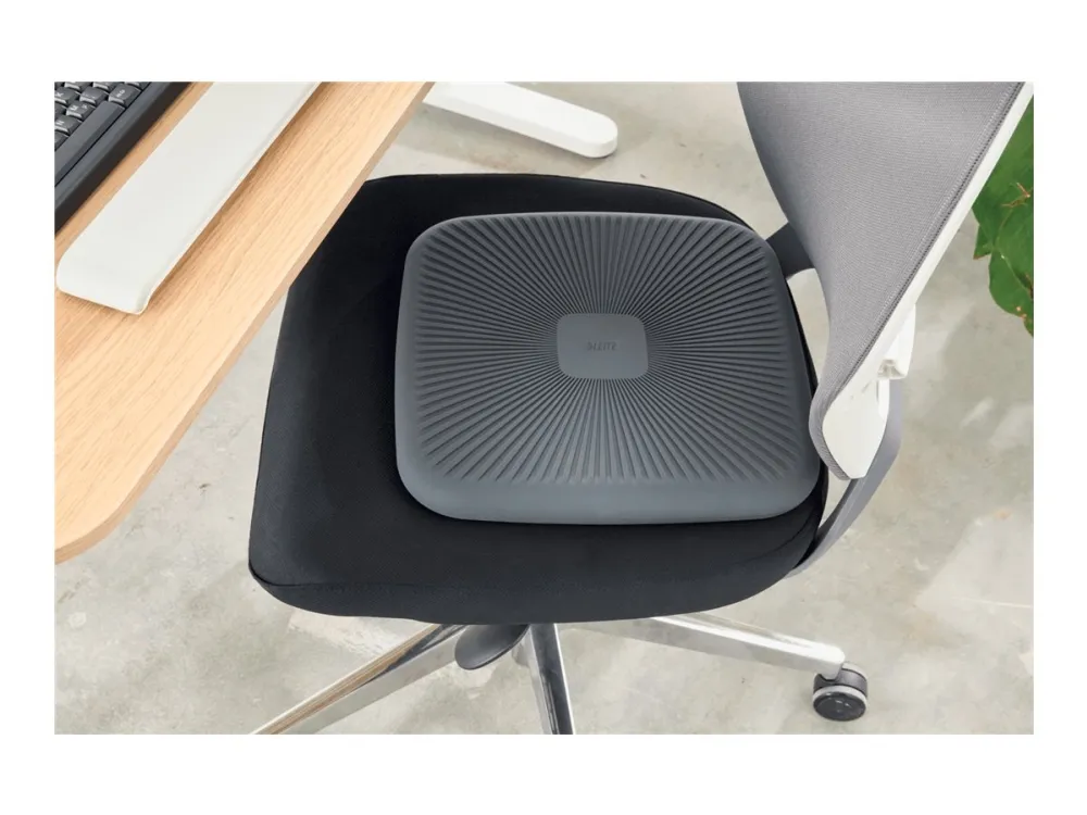 The Leitz Ergo Active wobble cushion is the perfect seat pad for a comfortable and active workspace. Designed to be used on any chair, this inflatable seat cushion helps strengthen the back by creating micro-movement to maintain balance while seated. The IGR certified seat support cushion will improve blood circulation and relieves spinal pressure to reduce discomfort caused by extended periods of sitting or health conditions such as sciatica. Square shape for more improved ergonomics thanks to enlarged sitting surface compared to standard round wobble cushions and intuitive correct positioning on chair. With its minimalist design, this stylish orthopedic seat cushion can have a positive impact on wellbeing by effortlessly creating the perfect active working set-up.
