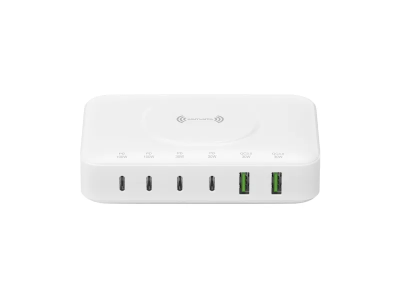 Ladestasjon: 2 x - 4-stifts USB-type A QC 3.0 - utløp - 30 W Ladestasjon: 2 x - 24 pin USB-C with Power Delivery - utløp - 100 W Ladestasjon: 2 x - 24 pin USB-C with Power Delivery - utløp - 30 W Ladestasjon - trådløs styrematte - 15 W
