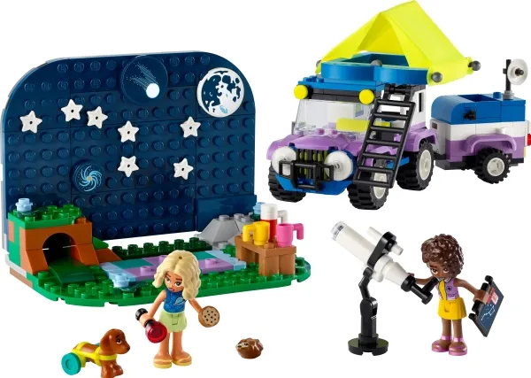 Barn som liker opplevelsesleker, får mange lekemuligheter med lekesettet LEGO® Friends Campingbil for stjernetittere (42603) for jenter, gutter og barn fra sju år. Settet inkluderer et byggbart leketeleskop, en campingbil med firehjulstrekk og sammenleggbart telt, to minidukker, en hundefigur og en pinnsvinfigur.