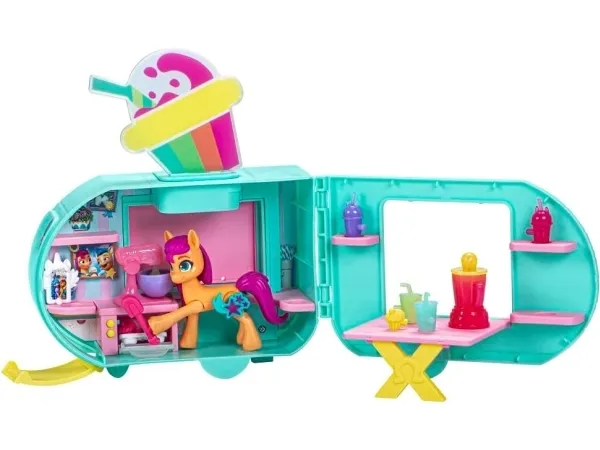 Serve up some magic with the Sunny Starscout Smoothie Truck 2-in-1 My Little Pony playset. Sunny is an adventurous Earth Pony who makes sweet treats in her mobile smoothie truck in the My Little Pony: Make Your Mark show. My Little Pony set comes with a 3-inch scale articulated pony figure that kids can pose in different ways. This food truck playset for kids opens up into a play kitchen with pretend food! Imagine making pretend cupcakes in the oven or smoothies in the blender accessory. Press this Sunny Starscout toy's hoof onto the truck's lever to turn on the neon light and open the truck window. Then, open the truck to reveal the play kitchen inside. Includes 15 accessories, some of which attach onto Sunny's hoof. My Little Pony food truck, kids playsets, and small dolls make great birthday gifts for girls and boys 5 years old and up. (Additional toys each sold separately. Subject to availability.)My Little Pony Sunny Starscout Smoothie Truck. Type: Ice cream van, Recommended age (min): 5 yr(s), Recommended age (max): 99 yr(s). Battery type: LR44. Product colour: Multicolour