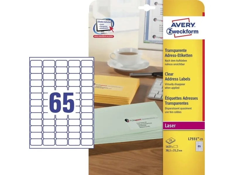 Coloured envelope, patterned paper or gift boxes - whatever packaging you are using you want to make sure important mail doesn’t get lost in the post. Adding your return address to a mini label and placing on the back of a parcel will help the postal companies to send undelivered mail back to you. However mail dropping through a letterbox could be the first impression a company gets of you so you need to make sure it looks professional. A clear mini label is the best way to achieve this as it blends in to coloured backgrounds for a printed look.\n\n- A sophisticated mini label for a professional printed look.\n- Ideal for return addressing, marking files, brochures and products for sale.\n- Perfect for white or light coloured backgrounds.\n- Save time with FREE Avery templates and software for Microsoft® Office. Easy to download and use.\n\nProduct Description:\n- 38.1 x 21.2 mm.\n- Laser / Colour Laser.\n- For: Addressing & Dispatch / Property & Inventory Labelling / Organising & Filing.\n- Colour: Clear.\n- 1625 Total Labels.\n- Works best with: brochure and catalogue labelling / return addressing / property labelling / organising.\n- 25 Sheets per Pack.\n- Permanent Adhesive.\n- 65 Labels per Sheet.\n- Coating: Matt.\n- Rectangular.\n- on A4 sheet.\n- Polyester film.