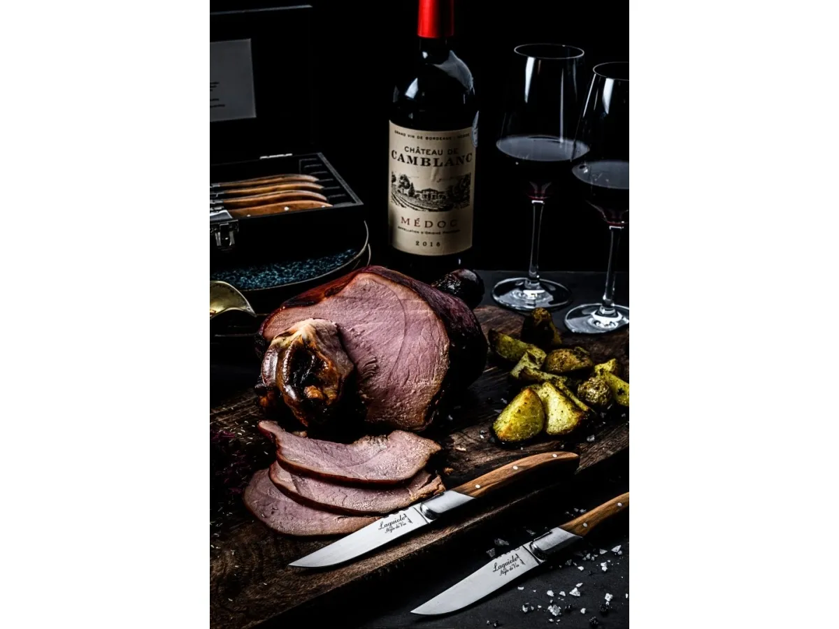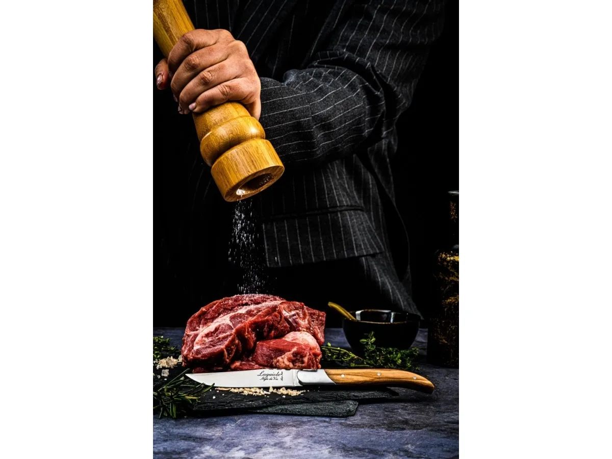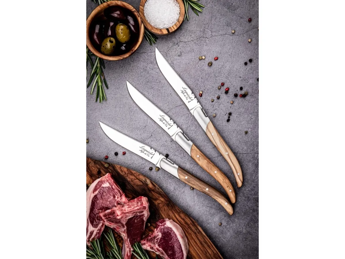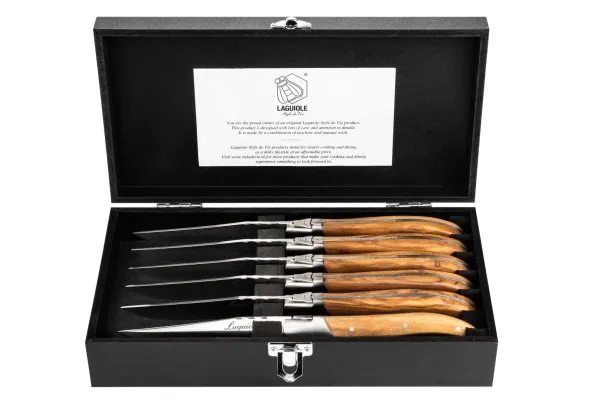 Vår toppserie. En av de mest sålda produkterna från Laguiole Style de Vie: Luxury Line grillknivar Olive wood. Vackert avslutad och med en tjocklek på 2,5 mm av mycket hög kvalitet. Grillknivarna har ett slätt vasst blad som gör att du kan skära varje köttbit perfekt. Grillknivarna tål inte diskmaskin.