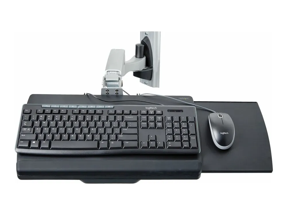 Included in the package are all necessary mounting hardware and detailed instructions, making installation straightforward. The ergonomic design, featuring a keyboard tray with a wrist rest, further enhances user comfort. Suitable for both landscape and portrait orientations, it adapts to any task, from data analysis to graphic design, ensuring a productive and comfortable work environment.