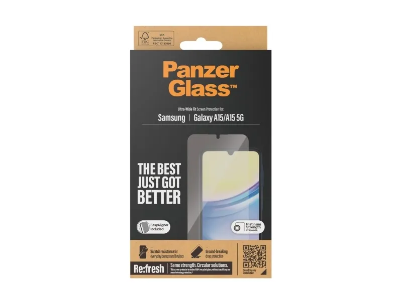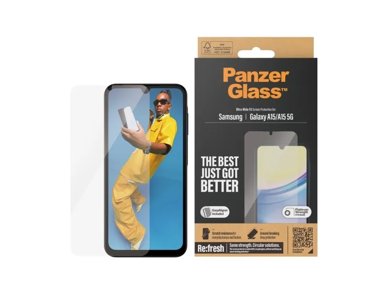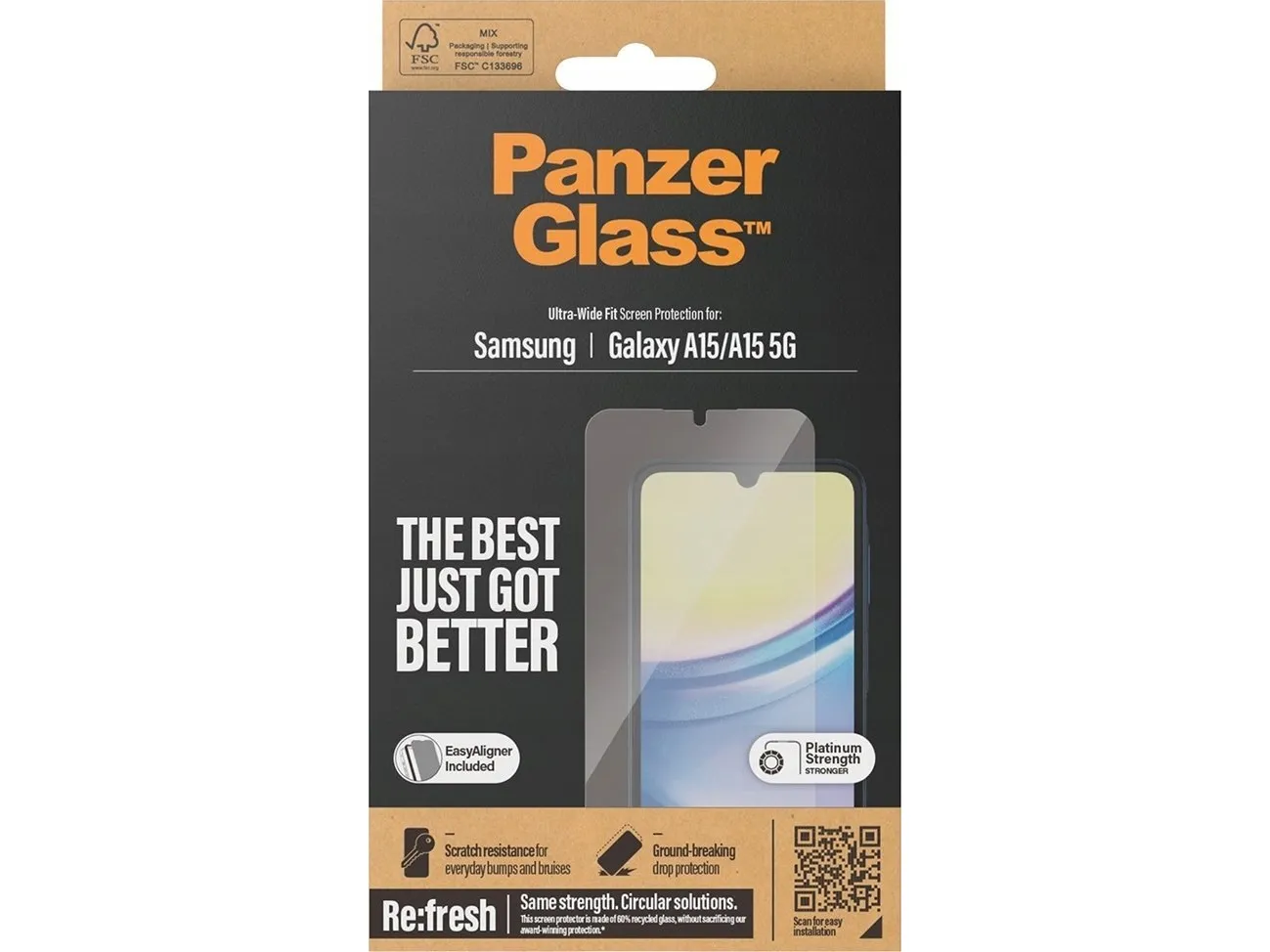 *Measured by third-party lab by comparing the mass of the new paper packaging introduced in 2023 with the mass of the previous paper packaging introduced in 2022 (CPRTC, report No. ZSA20231301-0016).PanzerGlass 7349. Brand compatibility: Samsung, Compatibility: Galaxy A15, A15 5G, Protection features: Bump resistant, Drop resistant, Scratch resistant. Product colour: Transparent. Quantity per pack: 1 pc(s)