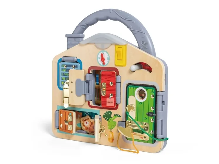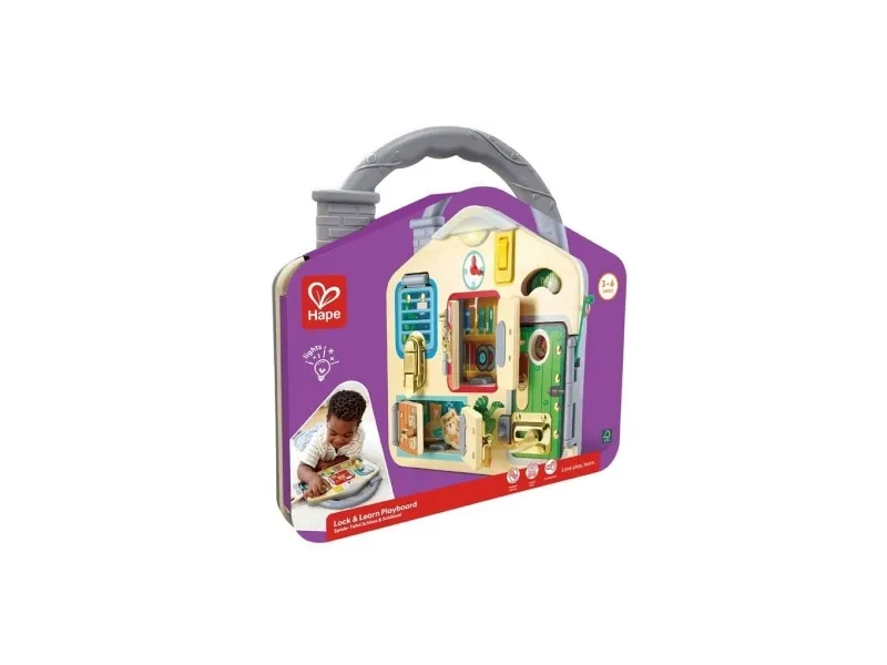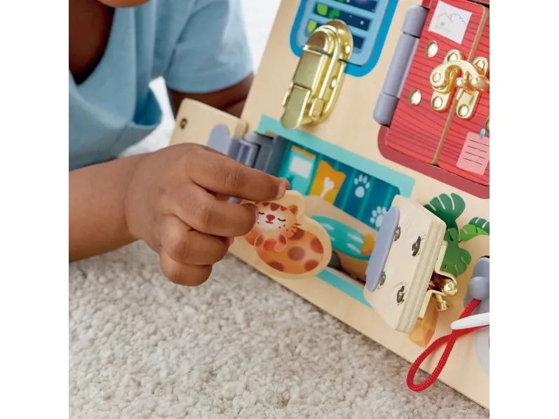 UTVIKLING AV FINMOTORISKE FERDIGHETER: Dette lekebrettet hjelper barn med å utvikle finmotorikk ettersom låsene krever presise fingerbevegelser for å frigjøre dem.^ØVE TÅLMODIGHET: Noen låser kan være litt vanskelige for små barn å åpne. Barn lærer å fortsette å prøve og ikke gi opp lett, noe som bidrar til å forbedre deres motstandskraft og besluttsomhet. ^LÆRING AV SIKKERHET: Over den grønne døren er et signal som kan skyves på for å si "Advarsel" eller "Hei". Et flott verktøy for å lære barn om fremmede og når de bør og ikke bør svare døren.^FULL AV TILBEHØR: Denne leken kommer med forskjellige låser som kan åpnes og låses. Den inkluderer også en funksjonell klokke og et lys pluss en kjæledyrkatt som kan gjemmes bak enhver dør.^LETT Å BÆRE: Låsebrettet kommer med et håndtak som gjør den enkel å bære.