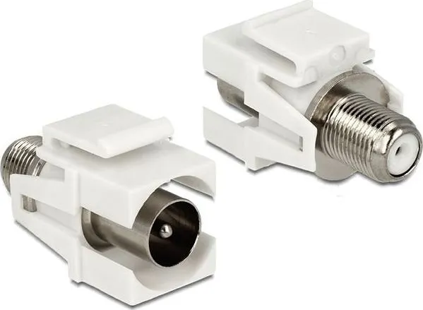This module by Delock can be used to connect antenna cables with F-connector and IEC-connector (coax). With its standardized dimensions it can be used for easy snap-in mounting in e. g. a Keystone patchpanel, face plate or surface-mount box.