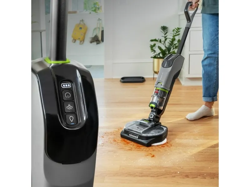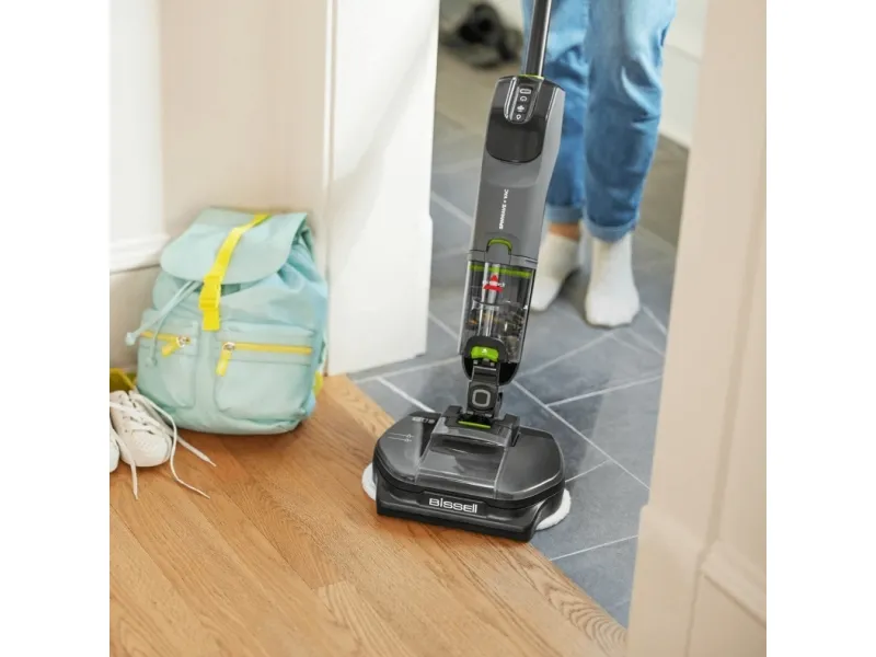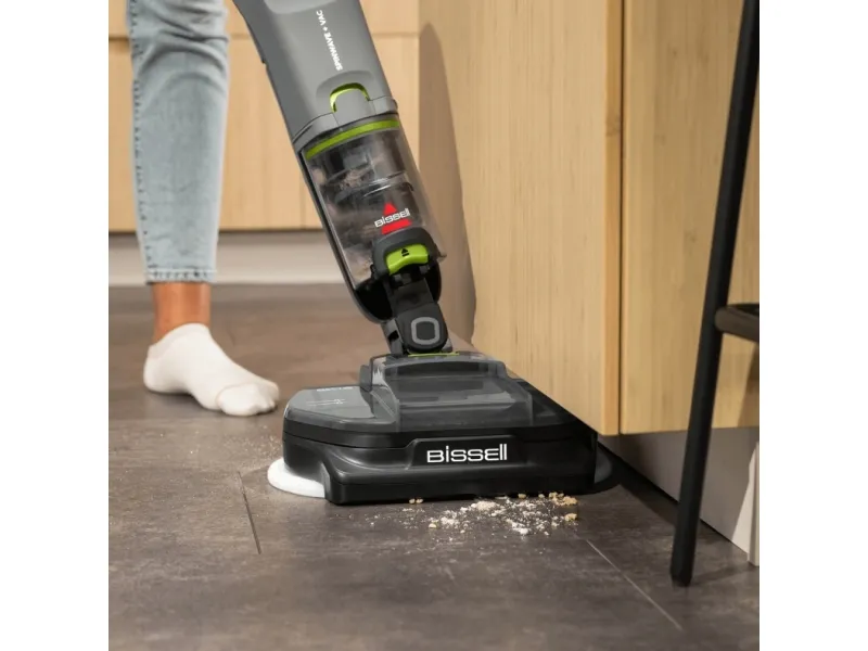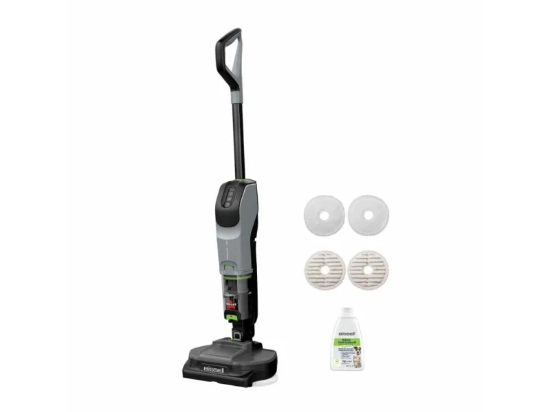 The BISSELL SpinWave + Vac Pet Pro combines vacuuming and mopping, making it a choice for homes with hard floors, tile, and wood surfaces. Its bagless design ensures easy maintenance, while cyclonic technology enhances cleaning efficiency. This cordless vacuum cleaner offers both dry and wet cleaning methods, effectively tackling dirt, pet hair, and stains. With up to 70 minutes of operating autonomy on a single charge, it is suitable for larger areas without frequent recharging. Included are essential accessories like a power adapter, reusable wet mopping pad, and cleaning solution, ensuring straightforward floor maintenance. The design also features edge cleaning capabilities, reaching corners and edges effectively. With a dirty water capacity of 0.4 liters, it accommodates cleaning without constant emptying, enhancing convenience during use.