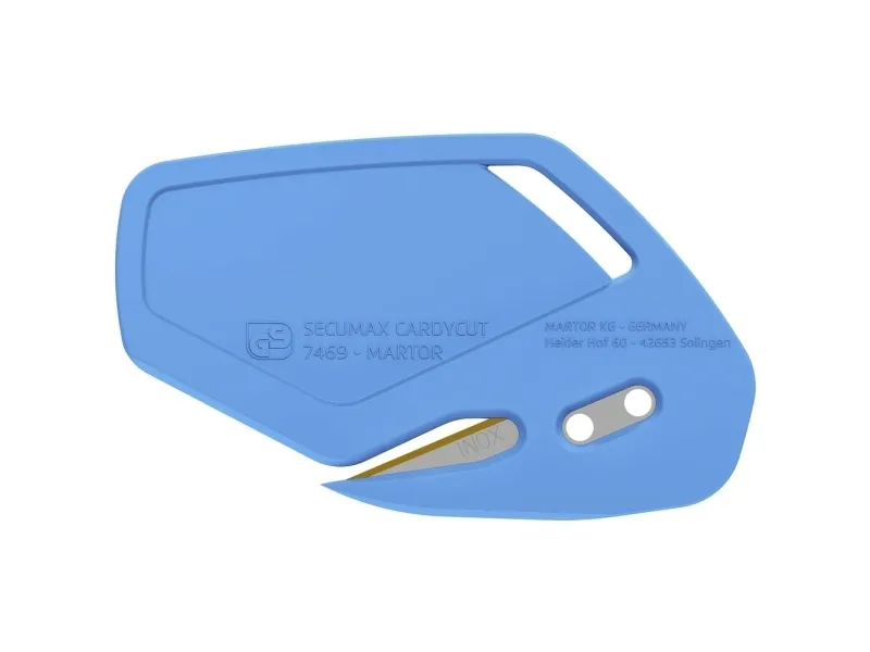 Sikkerhedskniv SECUMAX CARDYCUT Sikkerhed for alle: Den indstøbte og tildækket klinge kommer hverken for tæt på dig eller på varen. De skærer kun over på det, was de virkelig vil skære. Hurtig og manøvredygtig: Takket være den ekstra glatte plast glider SECUMAX CARDYCUT særligt smidigt langs spalter - også ved kurvede skær. Med skærene går det også i gang med det samme. Fordi klingen begynder meget langt foran. Ekstra bro: SECUMAX CARDYCUT kan håndtere udfordringer på en meget god måde. Endelig forbinder greb og næse et ekstra bro, der stabiliserer kniven, for eksempel ved kurvekørsel. Ingen rust: Skæreværktøj er udstyret med en rustfri kvalitetsklinge. Tin-belægningen sørger for, at du med din SECUMAX CARDYCUT kan klippe let og effektivt i længere tid. Bedst placeret: SECUMAX CARDYCUT går ikke så hurtigt tabt. Da sikkerhedskniven er udstyret med en øsken, kan den altid fastgøres på et meningsfuldt sted. SECUMAX CARDYCUT er med en vægtykkelse på kun 2 mm og den korte næse et af vores slankeste og mest kompakte skæreværktøj. Derfor kommer du også derhen, hvor andre knive skal passe. F.eks. i bittesmå spalter og smalle mellemrum, som det er tilfældet inden for bilindustrien. Den smalle adgang mellem klinge og plast gør det lettere at foretage kontrolleret skæring af enkeltlags folie og papir. Basismateriale: Plast