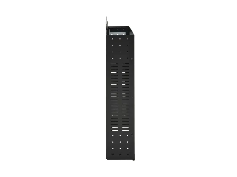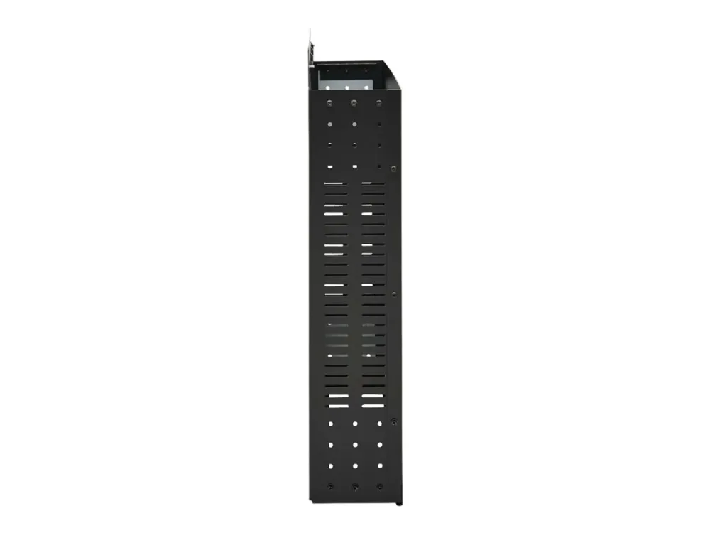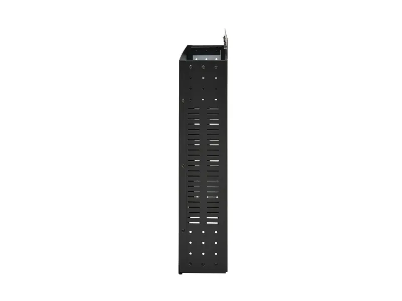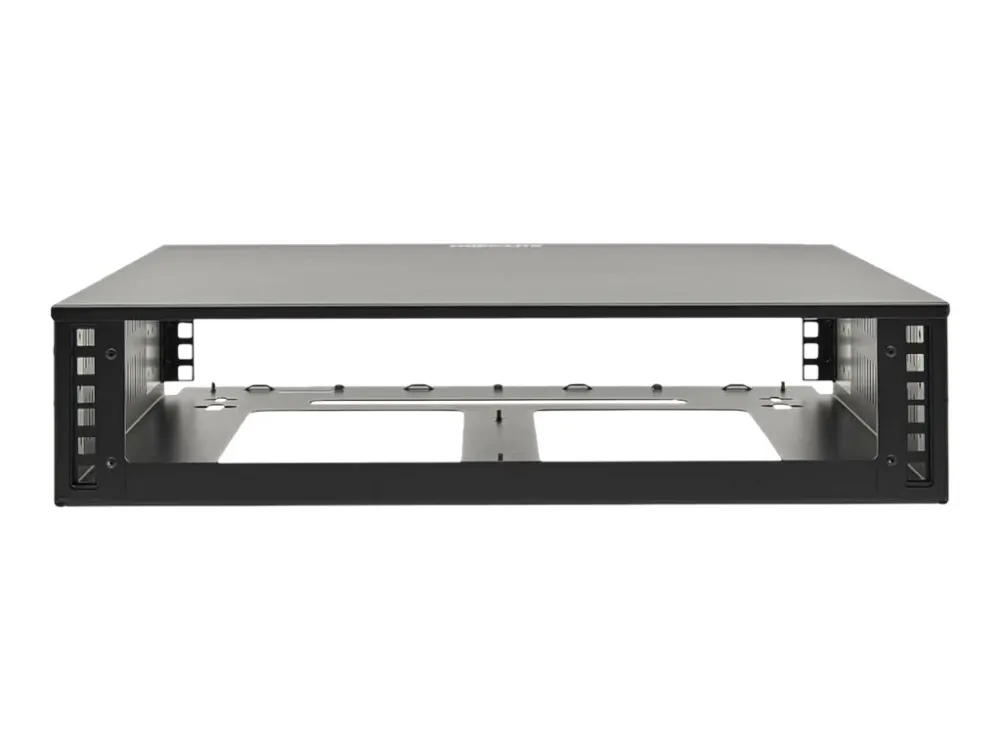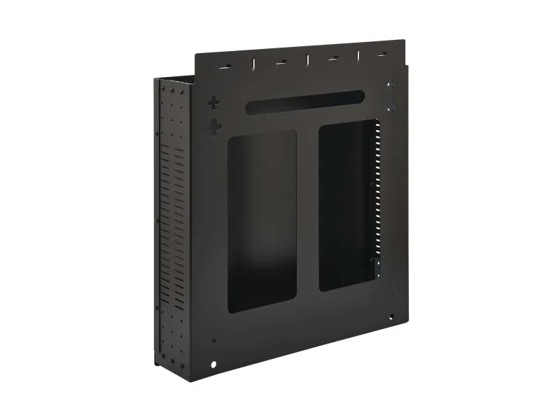The 2U cabinet extends less than five inches (12.7 centimeters) from the wall while housing network components up to 19 inches (48.3 centimeters) deep, including switches and patch panels. It is vented on both sides to allow air to flow freely and keep equipment cool. The top and bottom are open for convenient cable routing and access.