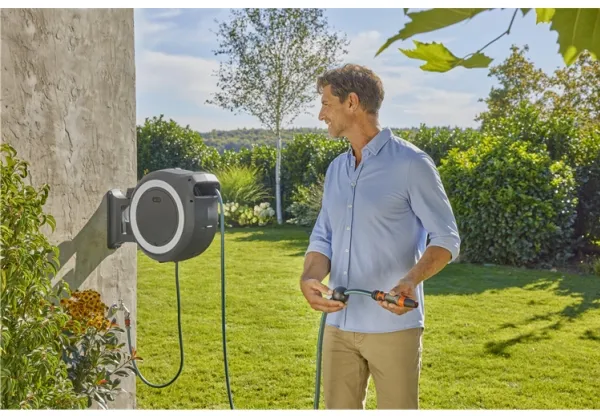 Den innovative GARDENA-batteri-væg-slangeboks PowerRoll XL Ready-to-use sæt med batteri-teknologi til automatisk oprulning, gør en bekvem vanding store haver mulig.