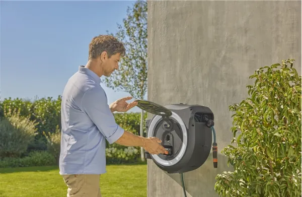 Nem håndtering også i store haver Den komfortable udrulning af haveslangen er ikke forbundet med nogen anstrengelse. Opbevaringsboks'en kan drejes i en vinkel på 180° på vægbeslaget, så ethvert område af have kan vandes fleksibelt, og slangen ikke knækkes. Svingning muliggør også en pladsbesparende position på væggen. Holderen har en praktisk opbevaringsplads til opbevaring, til opbevaring af sprøjter, brusehoveder eller andre vandingstilbehør, så de er lige ved hånden.