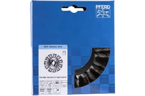 Pos COMBITWIST rundbørste trukket RBG HD dia. 125x12 mm M14 metaltråd-dia. 0,35 mm vinkelsliber Børste med meget aggressivt arbejde. Egnet til tunge arbejder i metalkonstruktioner som f.eks. udligninger, rustfjernelse, afgratning, pudsning af svejsesømme og fjernelse af limrester og svejsesprøjt. For at opfylde de særlige krav ved bearbejdning af rustfrit stål (INOX), anvender HEST ved PFERD alle INOX-børster trådkvaliteten 1.4310 (V2A). Praktiske erfaringer fra industrielle omgivelser bekræfter, at de har en meget god korrosionsbestandighed og optimal holdbarhed. Alle HEST-børster med INOX-besætning er mærket blå og er velegnet til brug på alle rustfrit stål (INOX), for eksempel V4A. Trådkvaliteten 1.4310 er tilbøjelig til at ferromagnetisk adfærd ved koldfastgørelse, det vil sige, at den er tiltrukket af magneter; årsagen til dette er en ændring af føleforholdene forårsaget af deformering, f.eks. under trådens bevægelse. Dette påvirker ikke INOX-Besondens kvalitet og korrosionsbestandighed. Den har sine korrosionsfaste egenskaber. Tråd i rustfrit stål (INOX) holder temperaturer op til 450 °C. Anbefalinger vedrørende anvendelse Vær opmærksom på de anbefalede omdrejningstal. For optimale resultater skal du anvende stærke vinkelslibere. materialer Aluminium Bronze Koboltbaslegeringer Meget varme arbejdsmaterialer Nikkelbaslegeringer (f.eks. inconell og Hasteloy) Superlegeringer baseret på nikkel eller titanium Yderligere NE-metaller Bløde titanlegeringer (trækbrudstyrke 500 N/mm²) Rustfrit stål (INOX) Titan Titanlegeringer Drevtyper Vinkelsliber PFERDVALUE PFERDERGONOMMICS anbefaler versionen COMBITWIST, så du på bæredygtig vis kan reducere vibrationsudviklingen, der opstår ved anvendelse, og forbedre arbejdskomforten.