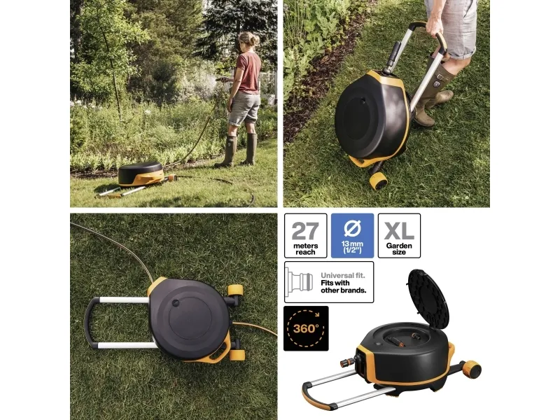 Desuden er X-Series™ Waterwheel XL udstyret med mange intelligente funktioner. Takket være profilhjulene og teleskopgrebet kan den nemt bevæges i haven, og det vandrette design gør det umuligt at vælte. Ved leveringen af X-Series Waterwheel XL hører en førsteklasses 13 mm ( 1/2 ) 20 m lang, slange, der automatisk rulles op, samt alt nødvendigt tilbehør, herunder slangetilslutninger og en spraydyse, som intelligent kan opbevares i selve tromlen.