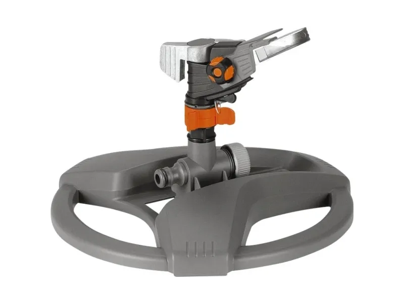 GARDENA Premium impuls-, cirkel- og sektorsprinkleren vander store flader uden besvær. Den består af en kombination af robust metal- og plastic. Derved er sprinklerkroppen meget stabil. Du skal blot indstille justeringsringen til at vande specifikke sektorer fra 25° til 360°. Den valgte sektor er takket være denne justeringsring ganske synlig. Præcisions-målingsdyse understøtter den nøjagtige udbringning af vandet. Ved hjælp af den store, behagelige drejeknap fastlægges afstanden. Du kan indstille den på 5 m op til maksimalt 12,5 m. Dermed kan en overflade på 75 m² op til max. 490 m2 vandes. Tilslutningsgevindet for at skrue sprinklerkroppen af har en diameter på 21 mm (G 1/2). Sprinkleren sidder fast på en plastslæde. Denne har tre metallag og er derfor meget stabil. Plastslæden garanterer en høj stabilitet. Sprinkleren har en almindelig GARDENA-systemtilslutning og er udstyret med en endekappe. På den måde kan den bruges med det samme.