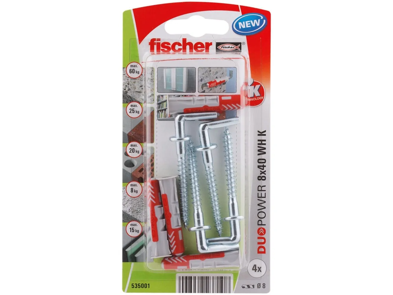 fischer DuPower 8 x 40 WH med vinkelkrog fischer DuoPower tilbyder særdeles gode holdeværdier med 2 komponenter: Den grå komponent i nylon af høj kvalitet aktiverer, alt efter byggematerialer, automatisk det optimale funktionsprincip (sprede, klapper), så den passer bedst. Den røde komponents ekspansionsvinger understøtter sikker spredning og giver ekstra sikkerhed til den grå komponent. Den medfølgende vinkelkrog er afstemt optimalt til fischer DuofPower. Dette garanterer en perfekt pasform.