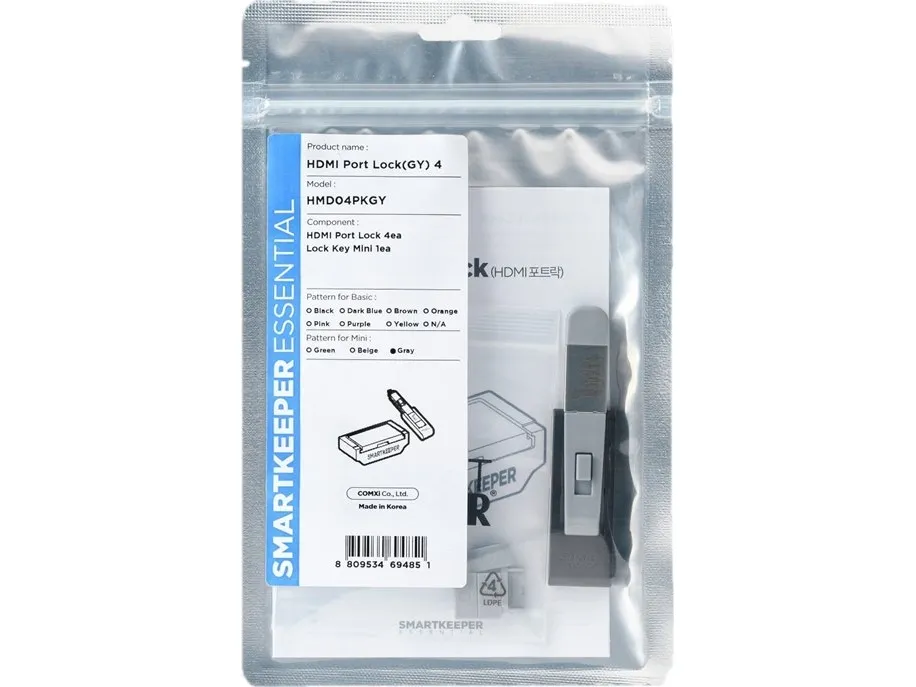 HDMI Port Lock: Physical Security Product HDMI Port Lock is designed to protect unused HDMI ports. Safety product provides protection for HDMI ports without power and software. Removable unlocking key Mini Port Lock Key (Key is compatible with other small SmartKeeper from Essentials of the same color). Installation and long use time. Price availability.Smartkeeper HMD04PKGY. Product type: Port blocker + key, Compatible ports/slots: HDMI, Product colour: Grey. Package width: 130 mm, Package depth: 20 mm, Package height: 205 mm