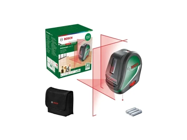 Bosch Universal Level 3. Maximum range: 10 m, Levelling accuracy (±): 0.5 mm/m, Self-levelling range (±): 4°. Type: Line level, Product colour: Black, Green, Tripod thread: 1/4". Power source: Battery, Operating time: 5 h, Battery type: AA. Width: 75 mm, Depth: 131 mm, Height: 126 mm