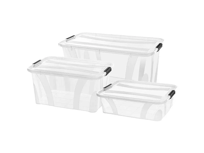 Opbevaringsboks Anzio sæt med 3 stk. 7 l, 14 l, 32 l. Sæt med 3 stk. opbevaringsbokse Anzio af plast i farve transparent. Indholdet er beskyttet mod snavs, støv og fugt. Alsidig anvendelse: Køkken, badeværelse, husholdning, hobby, camping, Kontor.