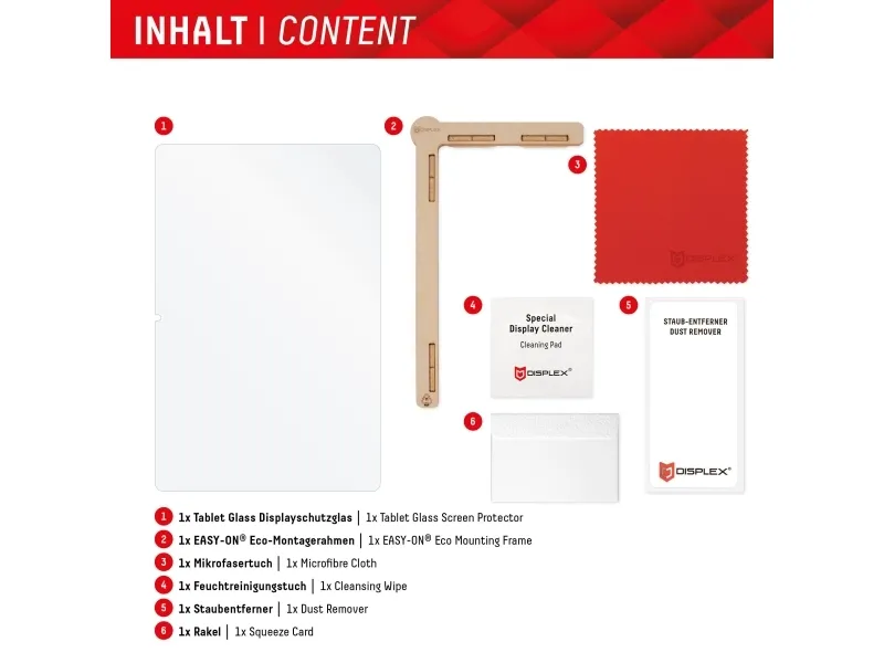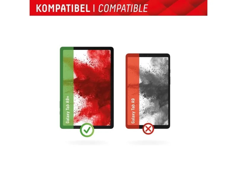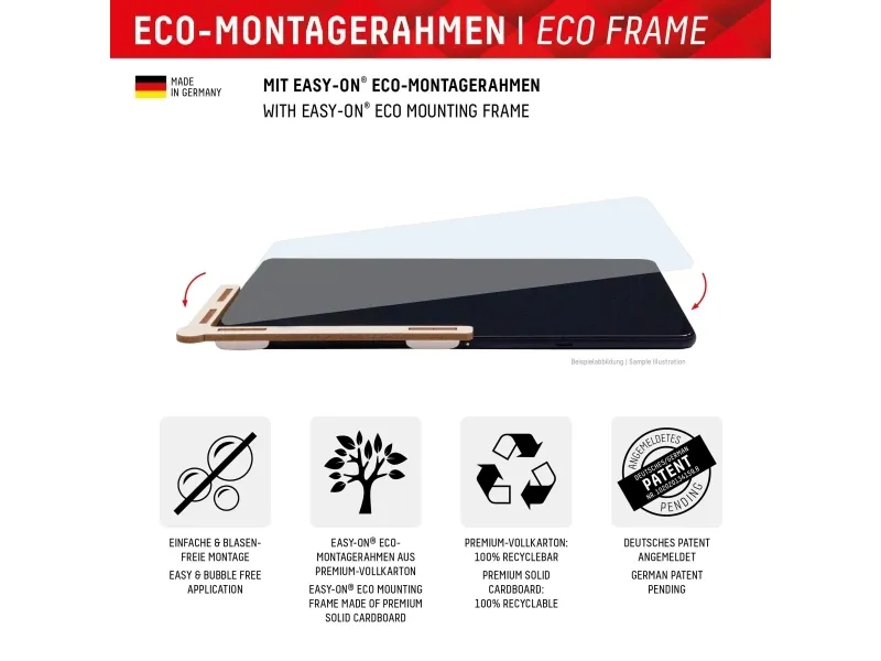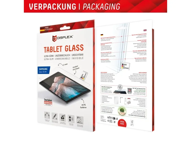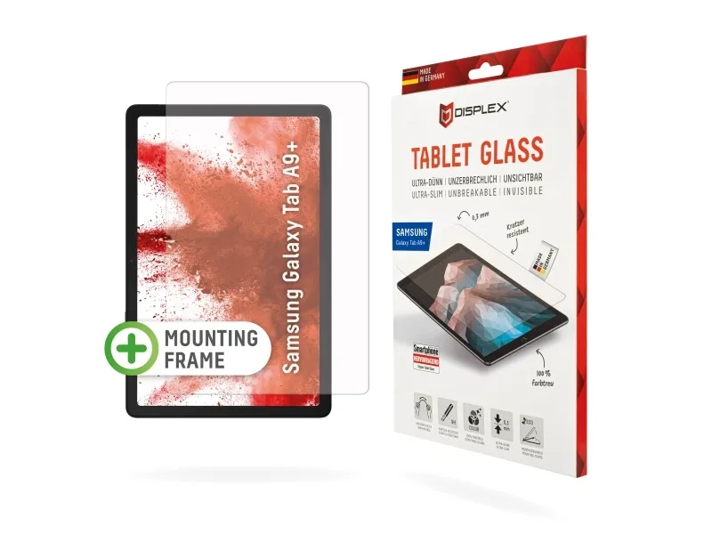 Simple, bubble-free application The EASY-ON® Eco Mounting Frame makes mounting the Tablet Glass quick, easy and precise. The result: no crooked positioning of the screen protector on the display, no concealed openings for speakers or microphones and certainly no bubbles under the protective glass. Good for the environment: the EASY-ON® Eco Mounting Frame is made of recyclable premium solid cardboard and can be recycled with waste paper without hesitation after use. Displex Tablet Glass (9H) for Samsung Galaxy Tab A9+, Eco Mounting Frame, unbreakable. Screen protector type: Clear screen protector, Material: Tempered glass, Hardness: 9H, Light transmission: 92%, Brand compatibility: Samsung, Compatibility: Galaxy Tab A9+. Weight: 20 g. Quantity per pack: 1 pc(s)