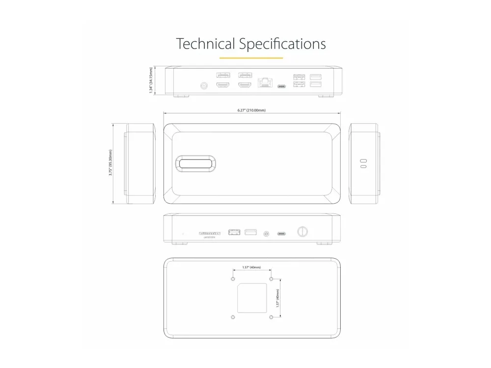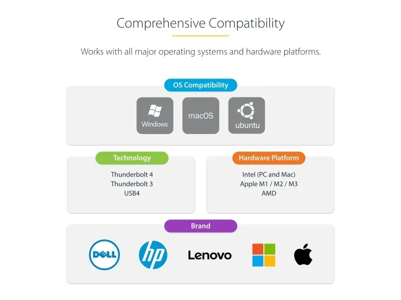The docking station utilizes the high 40Gbps throughput available from a Thunderbolt 4/3, or USB4 port to provide a wide range of port connectivity to suit a variety of applications.