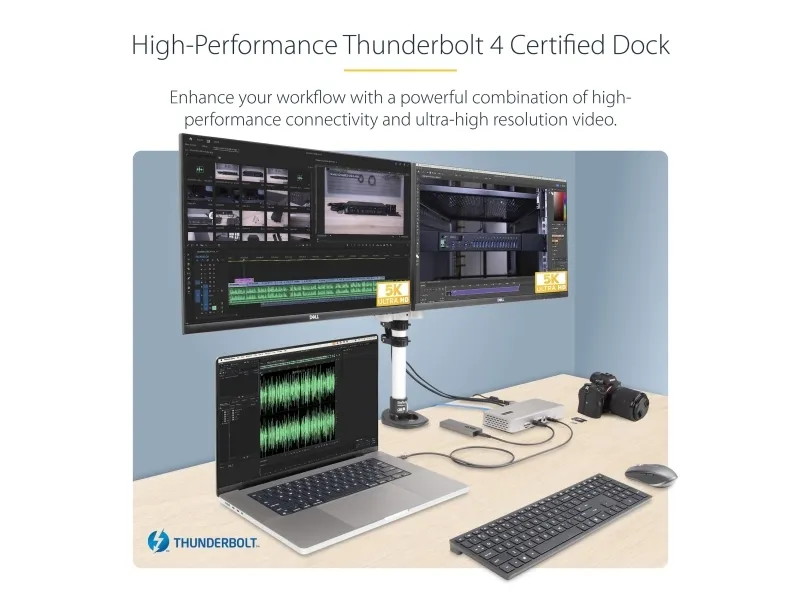 This Thunderbolt 4 Certified docking station uses a single Thunderbolt 4/3 or USB4, port on a host computer to add high-performance connectivity while charging the laptop.