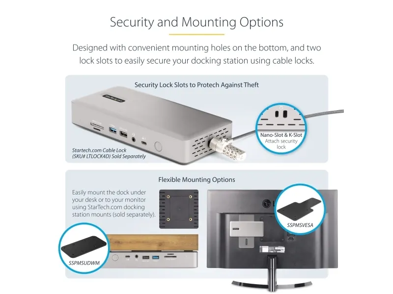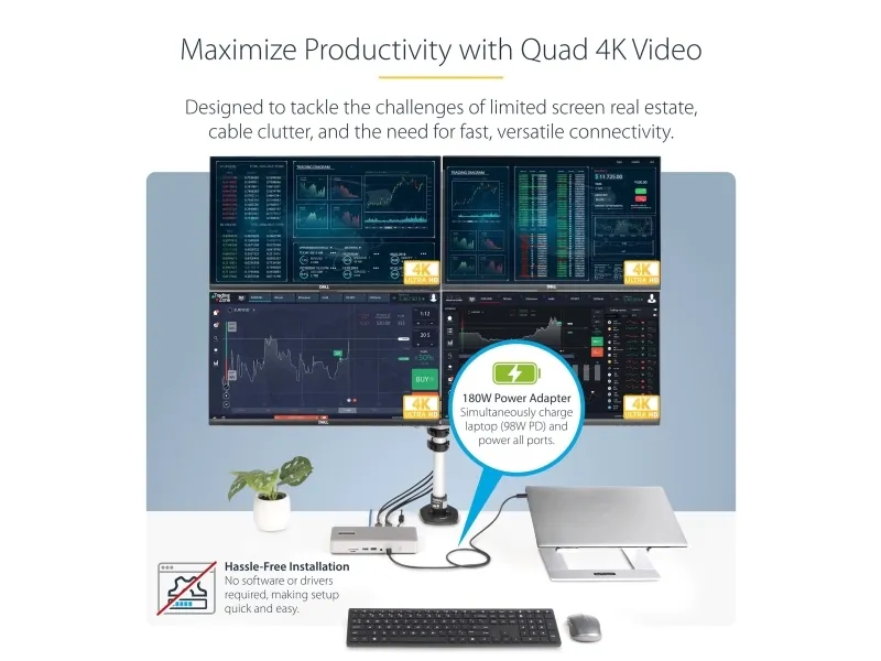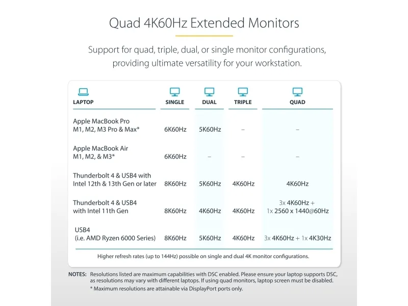 The dock is equipped with 2x HDMI and 2x DisplayPort video outputs for connecting multiple monitors to the host computer. The dock offers video flexibility, supporting single, dual, triple, or quad monitor configurations. With an Intel 12th Gen processor or higher that supports DP 1.4 with DSC, the docking station can support a quad-monitor configuration with resolutions up to 4K 60Hz. Quad displays are also available at lower resolutions or refresh rates on computers without DSC or with earlier Intel revisions. In addition, the dock supports a single 8K 60Hz display on either of the HDMI output ports.