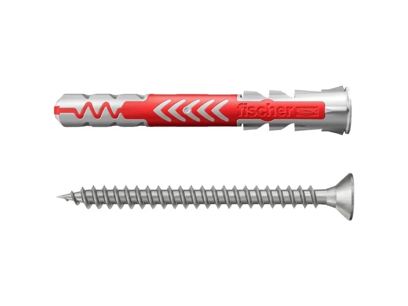 fischer DuPower 8 x 65 S skrue af ikke rustfrit stål A2 fischer DuoPower tilbyder særdeles gode holdeværdier med 2 komponenter: Den grå komponent i nylon af høj kvalitet aktiverer, alt efter byggematerialer, automatisk det optimale funktionsprincip (sprede, klapper, knob) for den bedste pasform. Den røde komponents ekspansionsvinger understøtter sikker spredning og giver ekstra sikkerhed til den grå komponent. Enkel isætning af skruer og rigtigt træk til sidst. Ingen overdrejning af skruen. Kanten, der er formet på dyvelhovedet, forhindrer, at dyvelen glider i borehullet. De medfølgende skruer er optimalt afstemt til Fischer ekspansionsdyvlen DuofPower.
