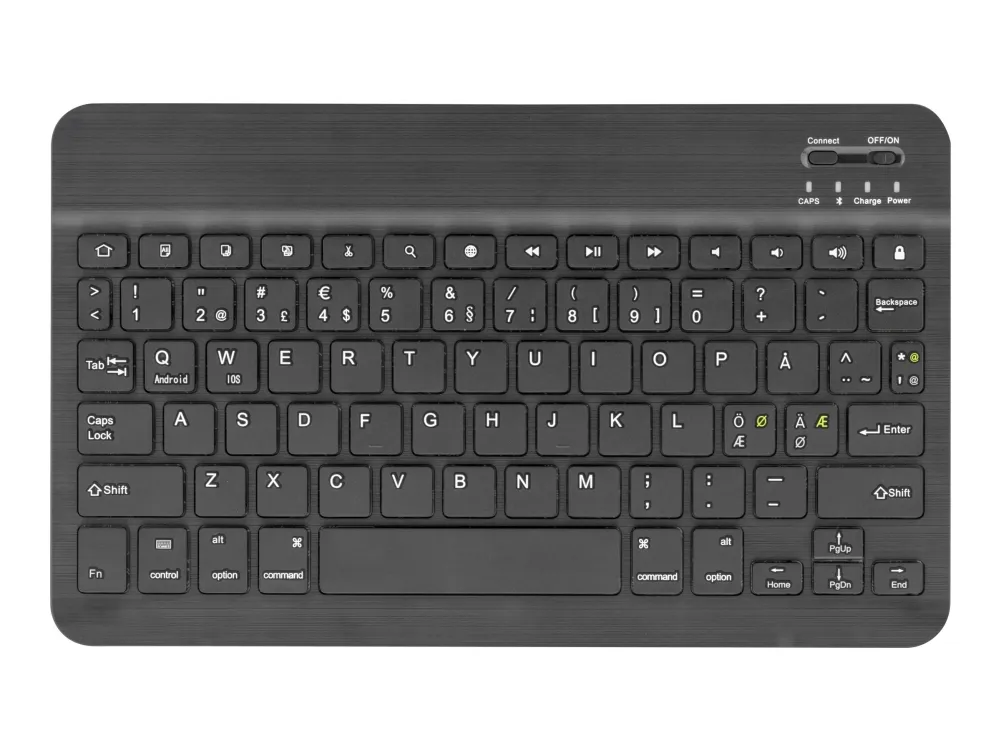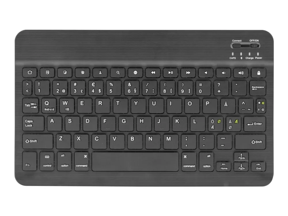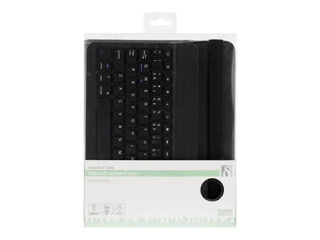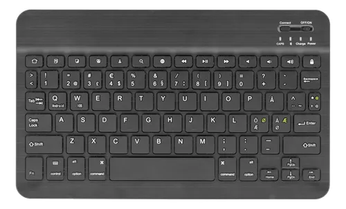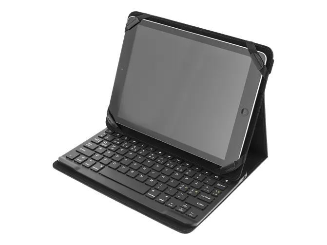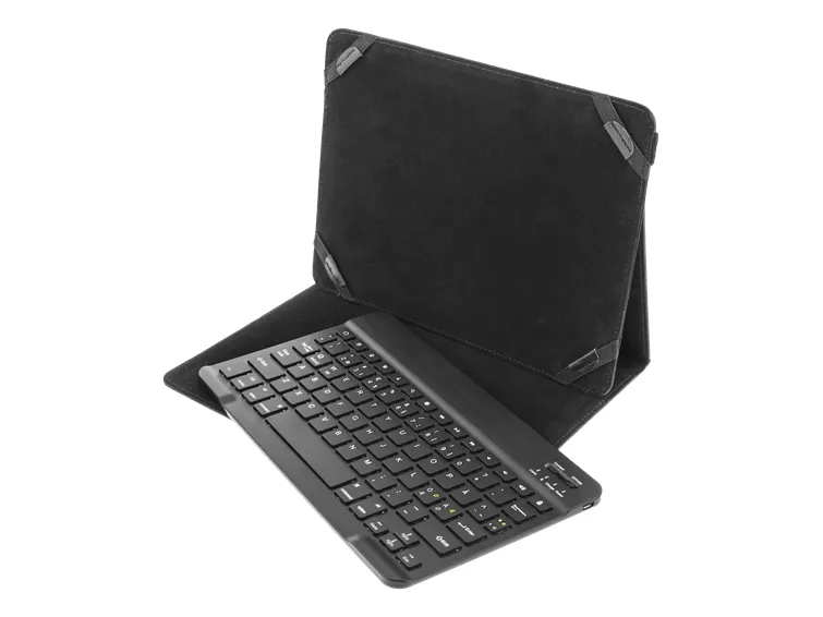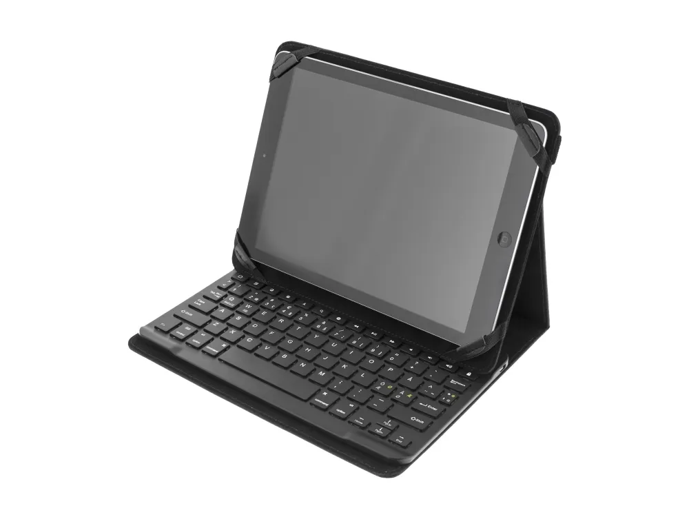 Fodral och tangentbord till din surfplatta. Inte nog med att du får ett praktiskt och snyggt fodral i konstläder som skyddar din suftplatta, du får även med ett ultratunt tangentbord i aluminium. Tangentbordet har ett inbyggt batteri och laddas via medföljande USB-kabel.