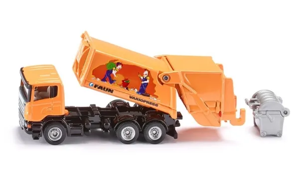 Originalt renovasjonsbil med stor søppelkasse. Robust og stabil konstruksjon med løfteanordning for avfallsbeholder og utmerket mobilitet takket være gummidekk. Perfekt tillegg til andre siku-produkter. Målestokk: 1:87, Materiale: Metall/Plast, Mål: 13,6 x 3 x 4 cm.