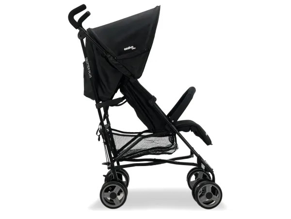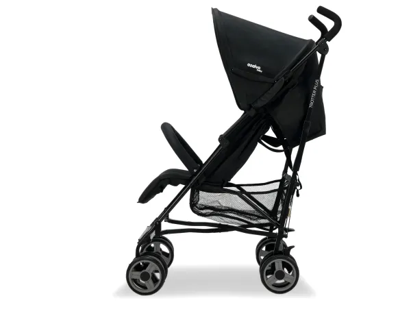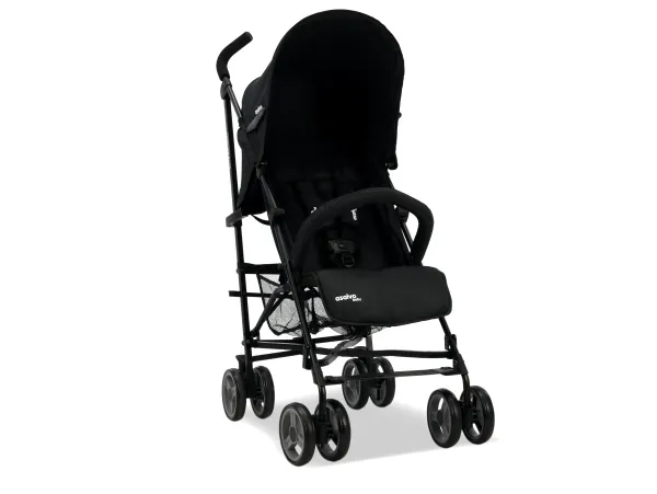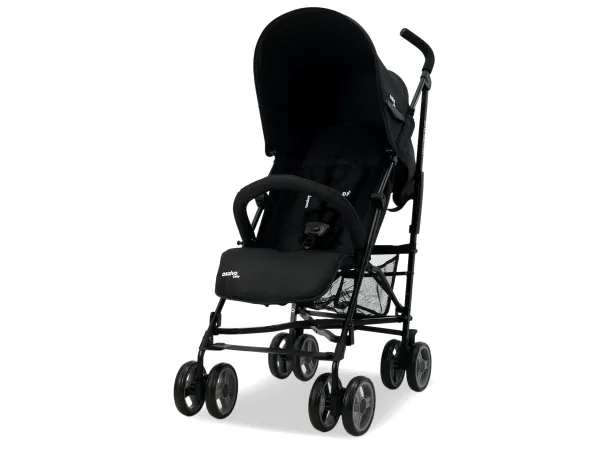 Egenskaber: Stel i stål 4 dobbelthjul Fast, drejelige forhjul Unik, let tilgængelig bagbremse Stort og behageligt ryglæn Meget let sammenklappelig kaleche Automatisk sikkerhedslukning ved foldning En-hånds sammenfoldning 5 punkts sele med skulderbeskyttere For børn fra fødslen til en maksimal vægt på 15 kg. Overholder EU Standard EN 1888