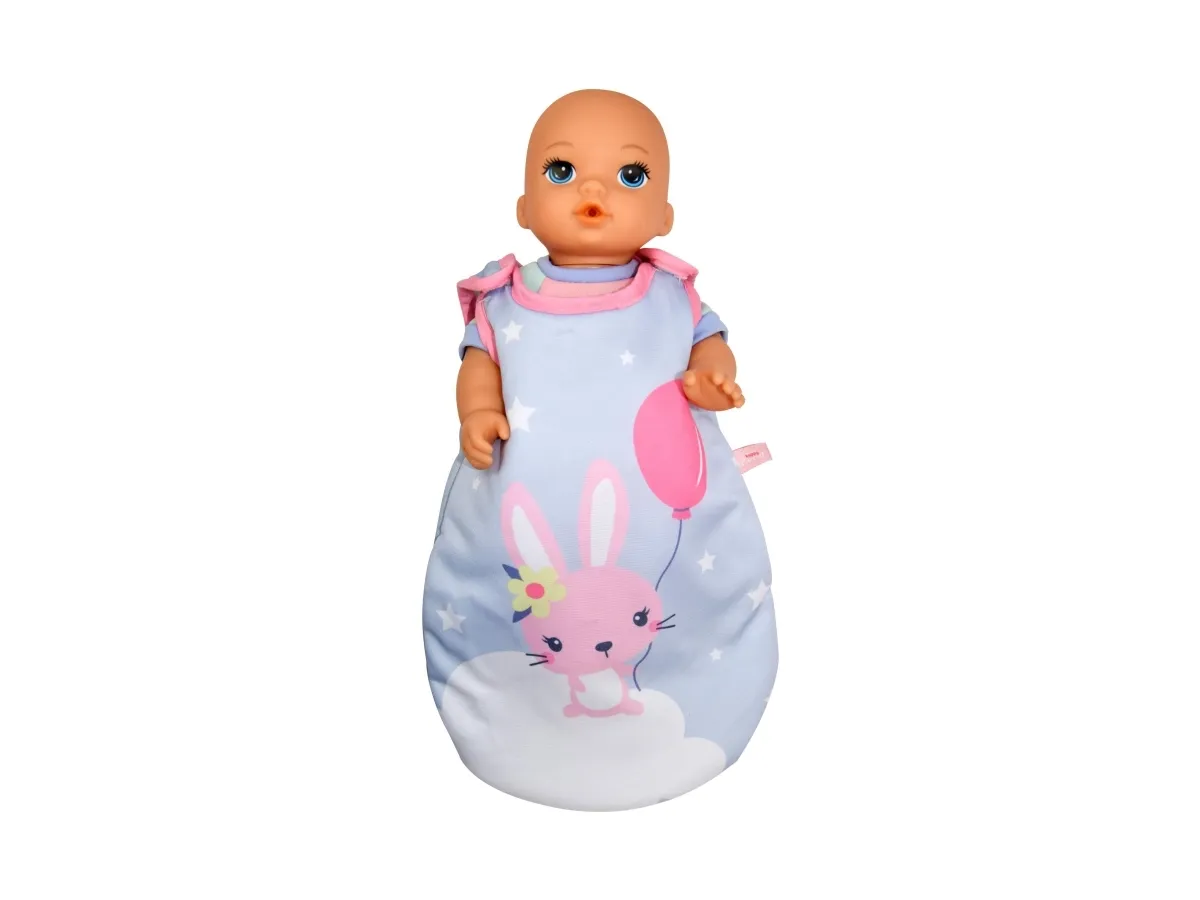 Drømm søtt! Kanskje dukken din drømmer om å gå på skyer som kaninen på soveposen. Soveposen med det søte drømmende motivet har borrelås-festing på skuldrene og passer til dukkestørrelse 32-43 cm. Fra 24 måneder.