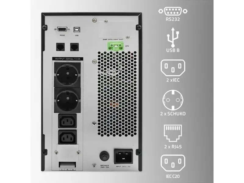 1 x forvaltning (RS-232) - 9-pin D-Sub (DB-9) 1 x forvaltning (USB) - 4-pins USB-type B 1 x EPO (emergency power off) 2 x forvaltning - RJ-45