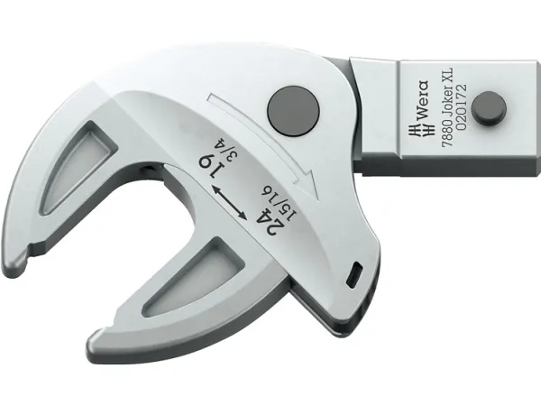 7880 Joker XL selvjusterende indstik-gaffelnøgle til nøglevidde 19-24 mm, 14 x 18 mm Selvjusterende indstik-gaffelnøgle til sekskant-skruehoveder eller -Møtrikker, til momentnøgle i serien Click-Torque X og XP med 14x18 mm holder. Dækker alle metriske og tommemål inden for det pågældende anvendelsesområde. Med de trinløst og parallelt førte kæber erstattes flere enkeltgaffelnøglesæt. Den nødvendige størrelse indstiller sig ved påsætning på sekskantmøtrikker eller skrue trinløst fra sig selv. Den integrerede løftemekanisme klemmer sekskant-skruen eller Møtrikken skår sikkert ind mellem kæberne, hvilket reducerer was og skader betydeligt. Skraldefunktionen sørger for hurtige og gennemgående skruer uden at tage dem af. Ved brug af hjørnestørrelser kan en returdrejevinkel på kun 30° realiseres.