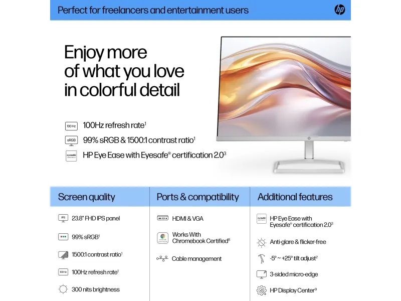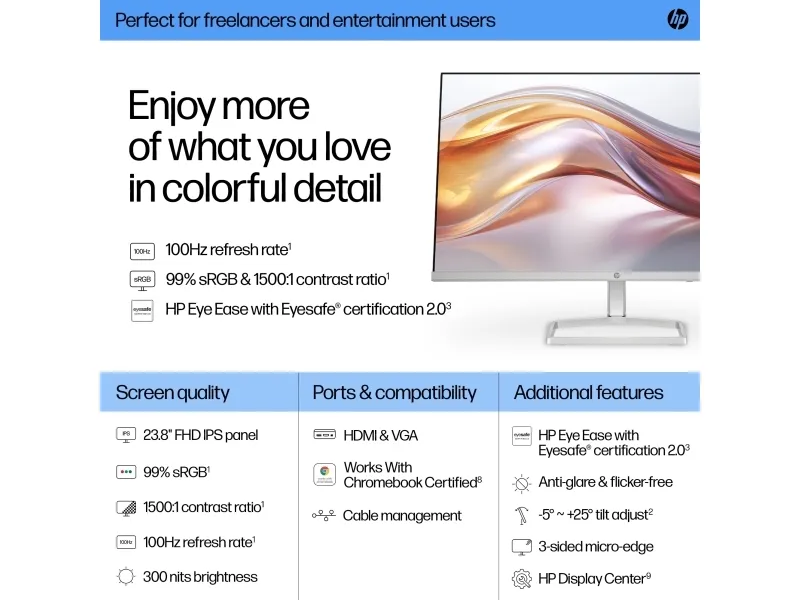 Flicker Free-teknologi, 3-sidet mikrokant, Low Blue Light-teknologi, 8-biters (6-biters + FRC) Color Depth, HP Eye Ease