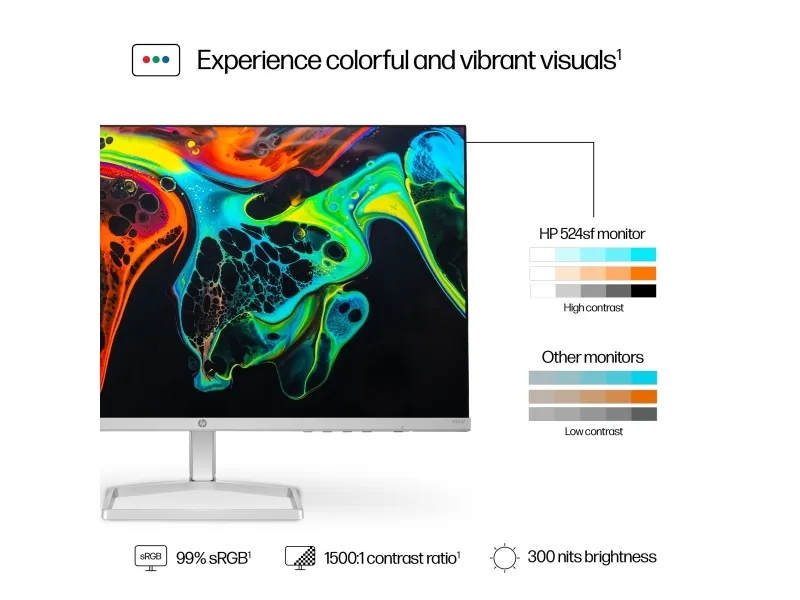 Discover the perfect blend of performance and eco-conscious design with the HP 524sf monitor. This 24-inch LED-backlit LCD monitor delivers Full HD 1080p resolution and vibrant colors, thanks to its 99% sRGB color gamut and 16.7 million color support. With a dynamic contrast ratio of 10000000:1 and a brightness level of 300 cd/m2, it offers vivid visuals and sharp details for both work and entertainment.