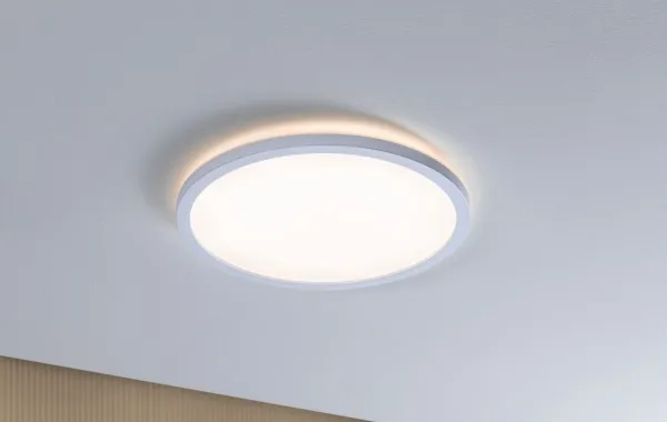 Led-panel Aria Shine Backlight IP44 IP44 stænkbeskyttet til badeværelse og lignende rum Backlight teknik for endnu mere diskret, næsten svævende lysoptik Ultrafladt design: Monteringshøjde kun 28 mm Farvetemperatur: 3000K - varm hvid Kan monteres på væg eller loft Der leveres et ensartet lys til rummet på basis af den mest moderne LED-teknologi. Særlig flad konstruktion Med en effekt på 16W egner det runde LED-panel Aria Shine i hvid og 293mm sig ideal til grundbelysning i bolig- og soveværelser eller køkkener. Panelets Varme, hvide lys giver en ensartet og flad belysning. Den ekstra backlight-teknologi fremtryller en særlig stemning og giver panelet et næsten svævende lyslook. Takket være lynklemmen og den særlige drejelås er panelet med sin ultraflade monteringshøjde på 28 mm meget nemt at montere.