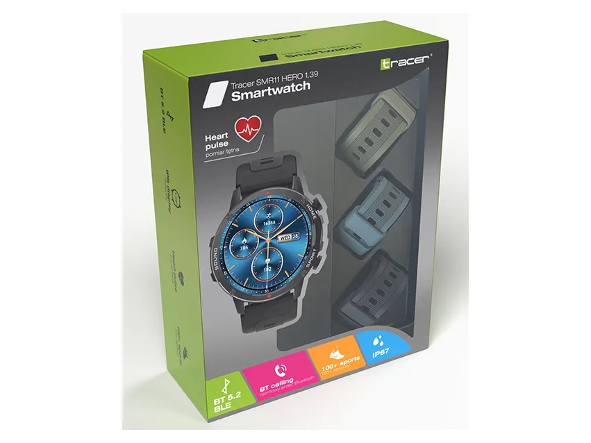 The Tracer SMR11 HERO smart watch combines advanced technology with practical features to enhance daily life. With a striking 1.39-inch IPS color display, users can enjoy vibrant visuals and easy navigation through its touch-sensitive screen and push buttons. The watch is equipped with multiple sensors including a pedometer, heart rate monitor, and pulse oximeter, making it an ideal companion for those who prioritize health tracking. Additionally, the device supports music remote handling and features like drink reminders and customizable watch faces, allowing personalization for each user. Crafted to fit wrist sizes from 155 mm to 235 mm, the watch is designed for comfort with its round case and adjustable strap. It boasts a long-lasting battery capacity of 300 mAh, providing an impressive standby time of 18 days on a single charge. With Bluetooth 5.2 BLE, the SMR11 HERO ensures seamless connectivity with devices for notifications on SMS, social apps, and incoming calls. Its water and dust resistance rated at IP67 allows for worry-free use in various environments, making it a versatile choice for everyday wear.
