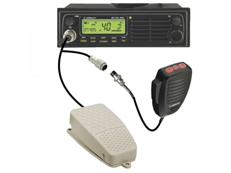 Albrecht PTT fodkontakt til CB-radioer PTT fodkontakt til tilslutning til 6-polede CB-radioer som for eksempel Albrecht AE 6491. Fodkontakten tilsluttes direkte til CB-apparatets mikrofontilslutning. Håndmikrofonen tilsluttes til forbindelseskablet til fodkontakten og bør placeres i nærheden af den talende person. Hvis fodkontakten aktiveres, udløses PTT sendeknap (push-to-Talk) på mikrofonen. Man behøver ikke længere at tage håndmikrofonen i hånden til afsendelse af trådløse krav. Takket være det 3 m lange kabel kan fodtasten installeres næsten overalt i køretøjet.