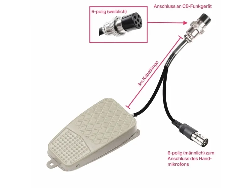 OBS! Denne produktbeskrivelse er endnu ikke blevet oversat til dansk af vores oversættere. Derfor er teksten maskineoversat fra den tyske originaltekst. Håndfri kommunikation er mulig med PTT-tryk på en knap i CB-radio Til 6-polede tilslutninger 3 m tilslutningskabel