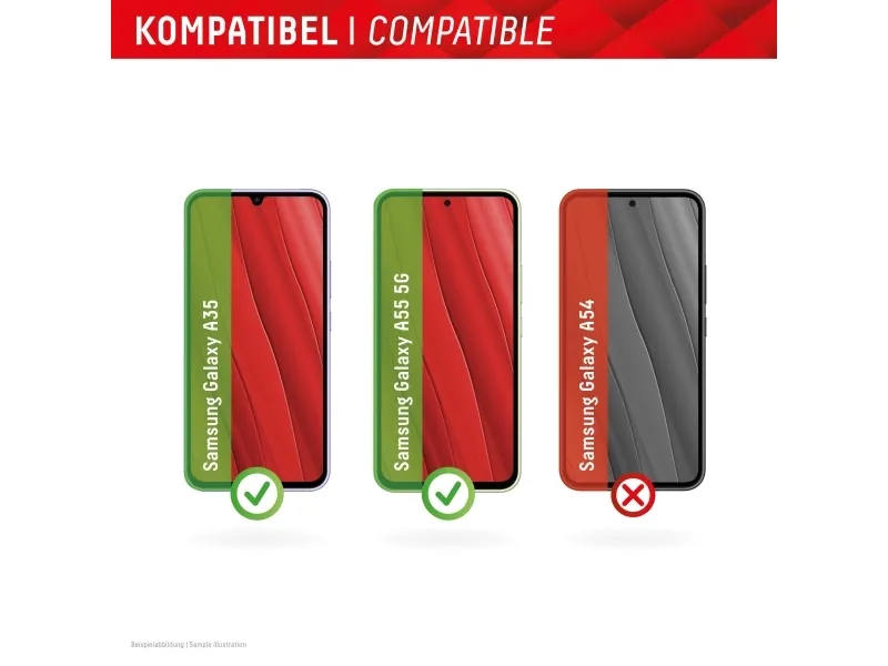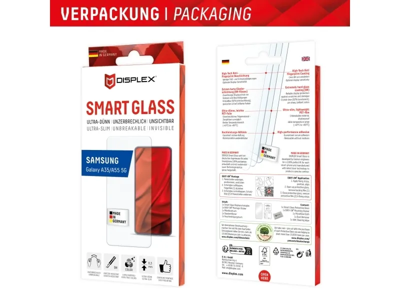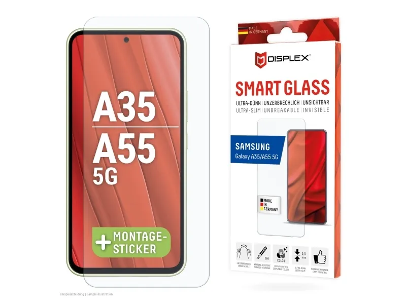 Simple & bubble-free application With the EASY-ON® Stickers and the accompanying video tutorials, mounting the Tempered Glass is incredibly quick, easy and precise. The result is worth seeing: no crooked positioning of the screen protector on the display, no hidden openings for speakers or microphones and certainly no bubbles under the protective glass.Displex Smart Glass (9H) for Samsung Galaxy A35/A55 5G, Mounting Sticker, unbreakable. Brand compatibility: Samsung, Compatibility: Galaxy A35/A55 5G. Dry application. Protection features: Dirt resistant, Scratch resistant, Shock resistant, Bump resistant. Product colour: Transparent. Quantity per pack: 1 pc(s)