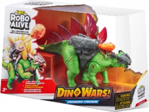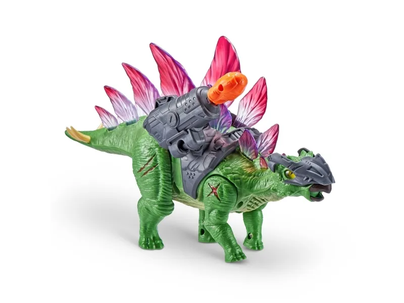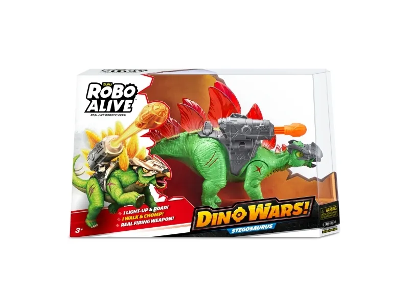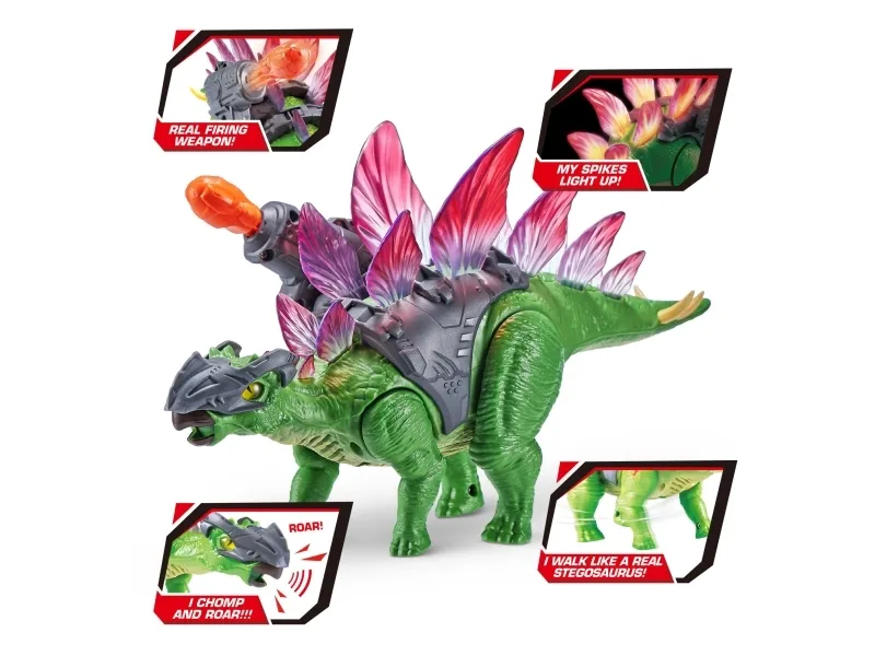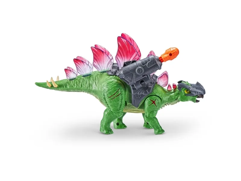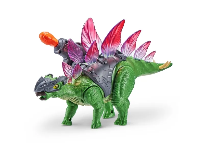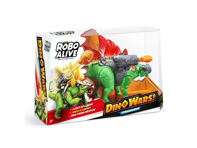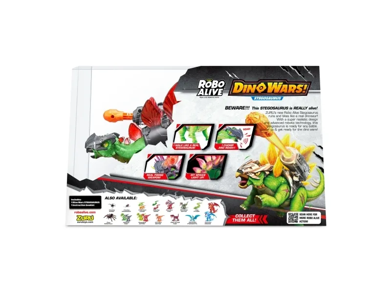 ZURUs nye Robo Alive Stegosaurus er klar for Dino Wars! Denne Stegosaurusen tråkker og går med ekte dinosaurbevegelser. Den brøler til og med med superrealistiske øyne som ser levende ut. Med store opplyste plater på baksiden, defensiv rustning og en stor dino-blaster, er denne Stegosaurus et must i din neste Dino Fight! Det er mer enn levende, det er Robo Alive!