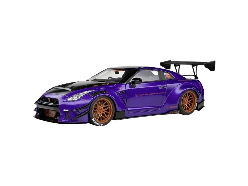 1:18 Nissan GT-R (R35) lilla Liberty Walk Body Kit 2.0, 2022 Adcast Vindueskarton med plastsokkel