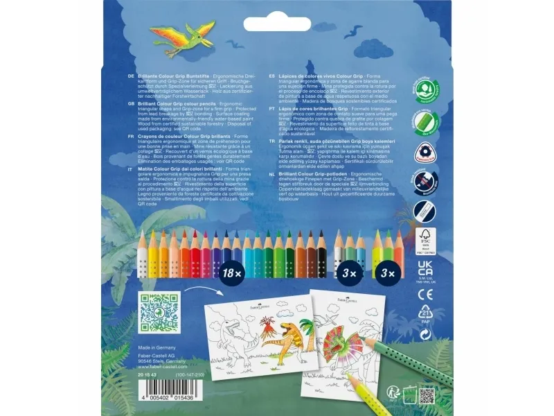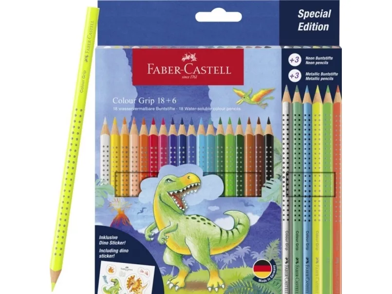 The Faber-Castell Grip colored pencils are fun and encourage children to develop their manual skills in a playful way. For younger or older children alike - the ergonomic triangular pencil shape with patented soft-grip zone allows effortless and easy drawing. The water-soluble pigments contained in color Grip pencils result in particularly beautiful drawings: simply apply your colors, use a wet paintbrush to blend them and achieve fantastic watercolor effects.