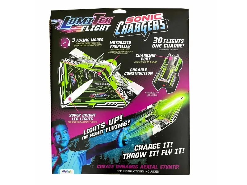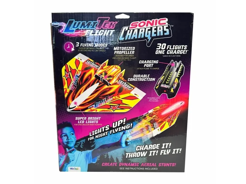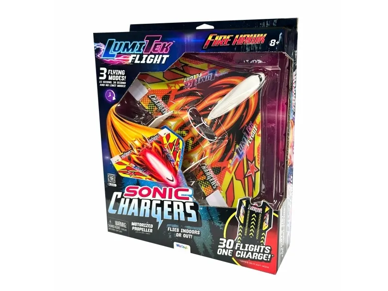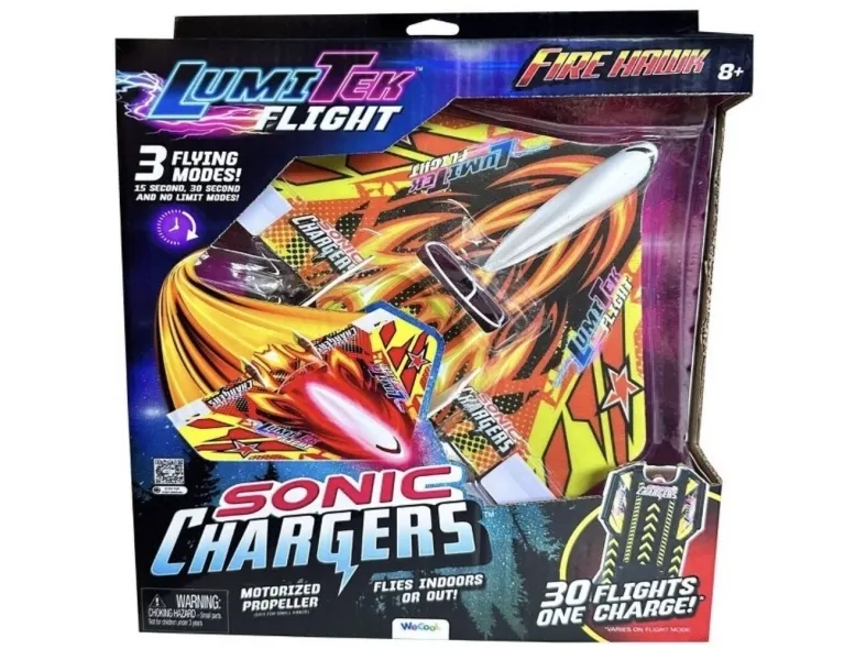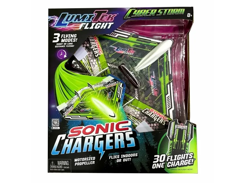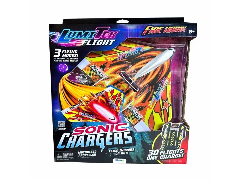 LumiTek Flight Sonic Chargers! Et super sejt fly til både inden- og udendørs brug. LumiTek Flight Sonic Chargers har 3 flyvetilstande og kan foretage 30 flyvninger på en enkelt opladning afhængigt af type af flytilstand. Flyet har en motoriseret propel designet til fart- og langdistanceflyvninger og så har den et super stærkt LED-lys til spektakulære natflyvninger! LumiTek Flight Sonic Chargers har en holdbar konstruktion og den kan lave fantastiske dynamiske stunts i luften Med LumiTek Flyet Sonic Charger følger en lade-station for nem og hurtig opladning. Så bare kom i gang med at flyve med din drømmeflyver LumiTek Sonic Charger Oplad det! Kast det! Flyv det! Vælg mellem 2 varianter: Fire Hawk og Cyber Storm