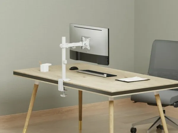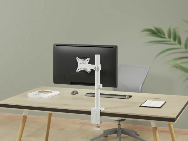 The bracket is designed to free up desk space and create a streamlined setup. Its durable construction ensures stability and support for your monitor. With a white finish, it adds a modern touch to your workspace. Easy to install and with cable management features, this desk mount bracket is ideal for creating a comfortable and organized work environment.