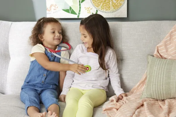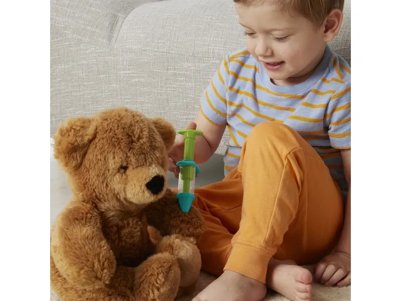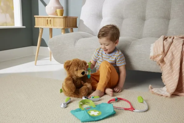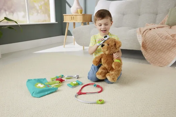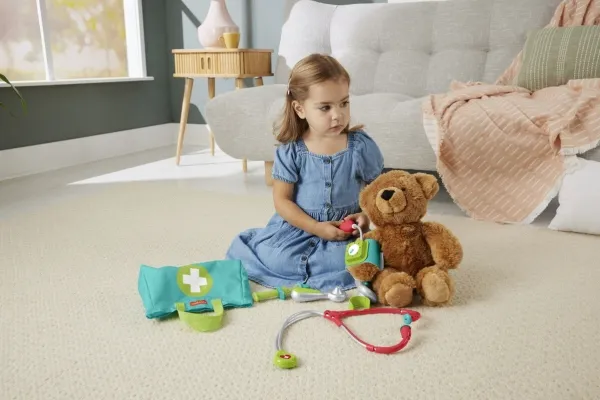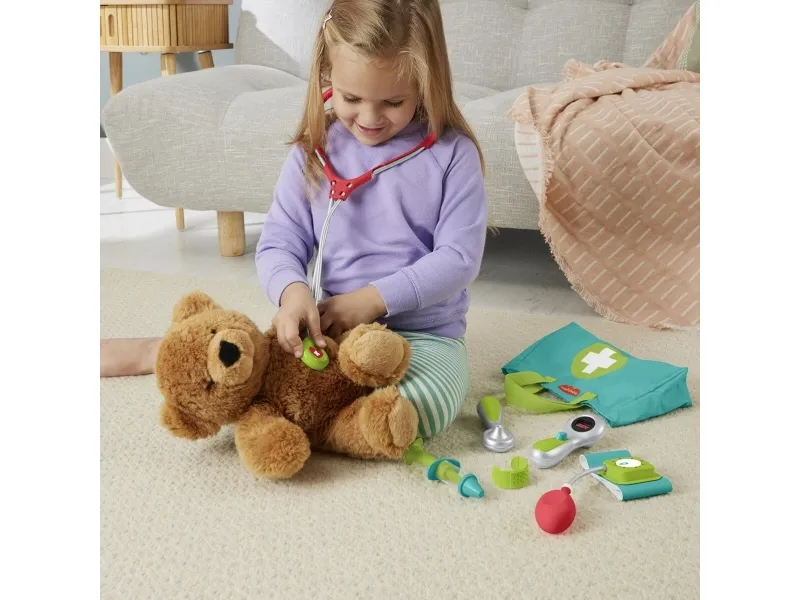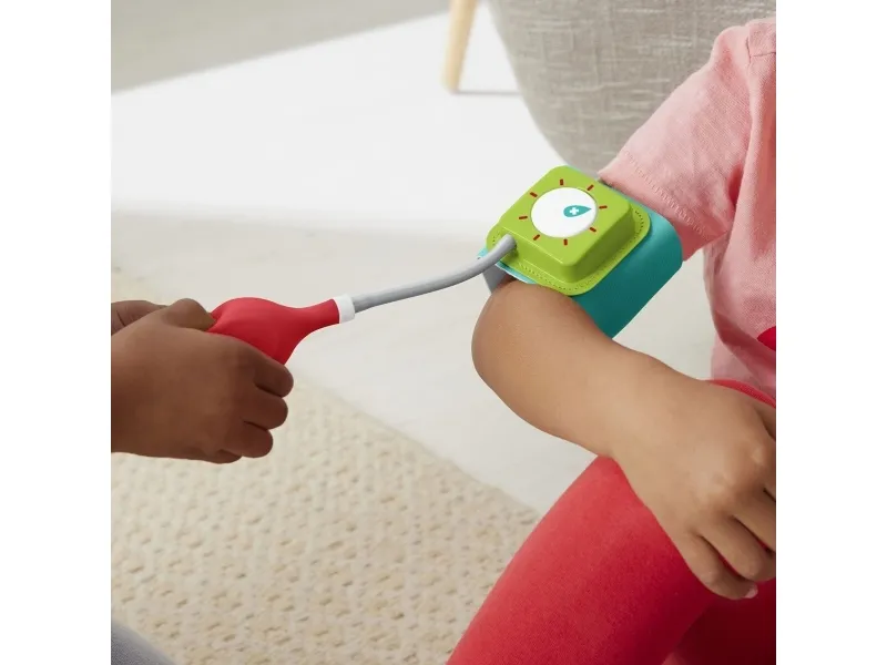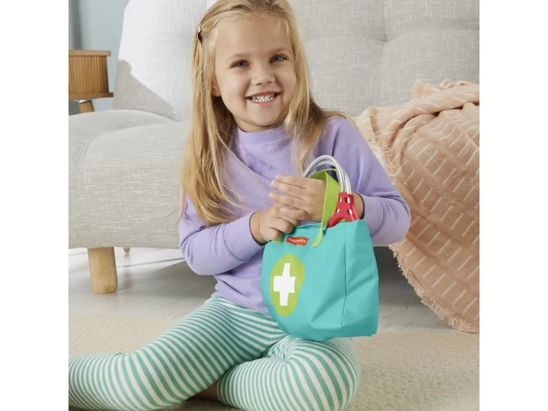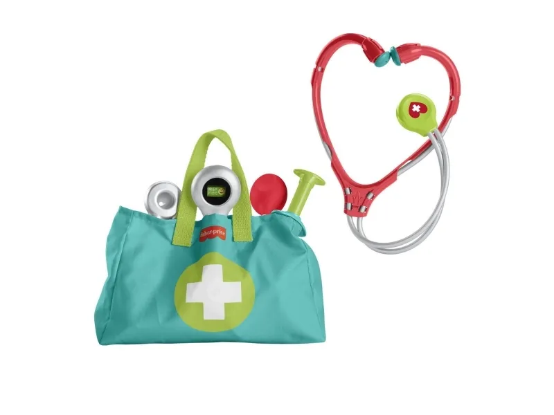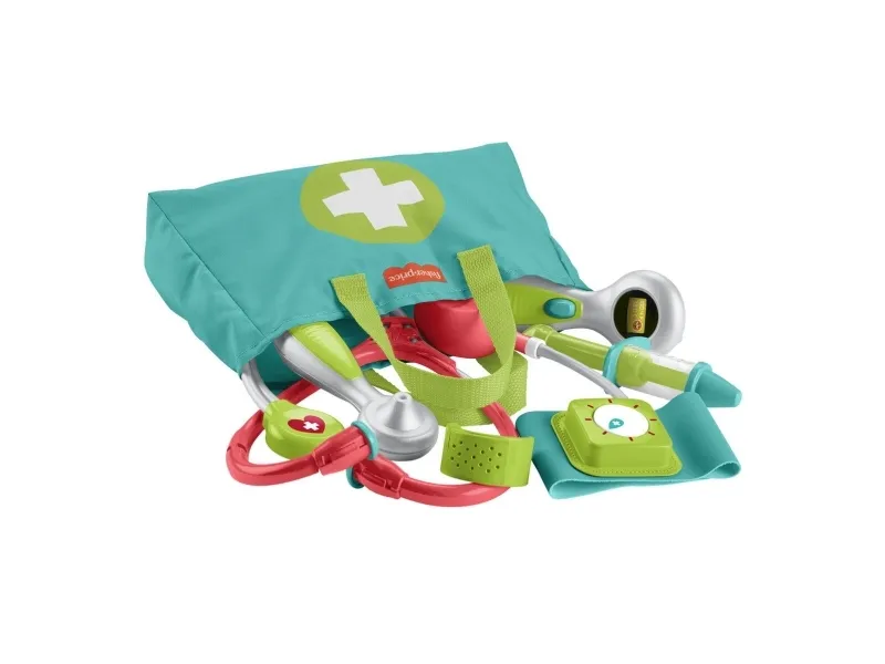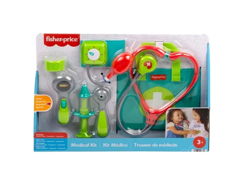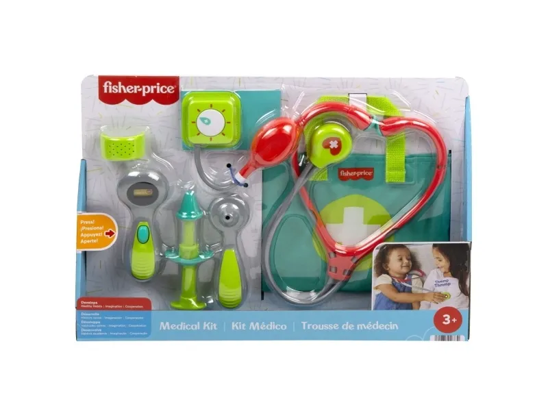 With the Fisher-Price Medical Kit, preschool kids can “treat” and “care for” patients with endless doctor role-play! This playset features 7 medical-themed play pieces for mini-MDs to use, including a stethoscope to 'listen' to their patient's heart, thermometer to 'check' their temperature, an otoscope to take a peek inside their ears, and a blood pressure cuff with a spinning gauge. Even getting a shot becomes fun with the toy syringe and a bandage cuff for pretend ouchies. Colours and decorations may vary.Fisher-Price Medical Kit 7-Piece Doctor Toys Preschool Pretend Play Set for Ages 3+ years. Type: Baby doctor, Recommended age (min): 3 yr(s), Recommended age (max): 7 yr(s), Product colour: Multicolour, Material: Plastic
