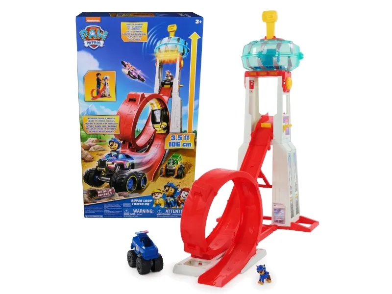 Get ready for thrilling high-speed rescue missions with Chase and his police car themed monster truck with oversized wheels, in the all-new PAW Patrol: Rescue Wheels Super Loop Tower HQ! This impressive PAW Patrol Tower stands nearly 4-feet tall, with lights and sounds, for an immersive experience. This is the largest PAW Patrol Tower yet, with its giant looping ramp, a command center that opens up to accommodate 6 pups, and parking spots for their PAW Patrol vehicles (Each Sold Separately) Bring home the excitement with the PAW Patrol: Rescue Wheels Super Loop HQ! The fun doesn’t end there. The Super Loop HQ is specially designed to launch most PAW Patrol vehicles, so, gather all your PAW Patrol toys, invite your friends over, and host an incredible vehicle launch party! PAW Patrol toys for boys & girls are great gifts for kids who are fans of the show, to foster imaginative pretend play and enhance fine motor skills. Relive cherished moments from PAW Patrol seasons, such as the Mighty Pups and the PAW Patrol Movie or create new adventures with individual PAW Patrol pups and their respective toy cars (each sold separately). Elevate the excitement with the complete Rescue Wheels team, including PAW Patrol vehicles, action figures and the all-new PAW Patrol Tower HQ for endless turbo-charged adventures inspired by the series!