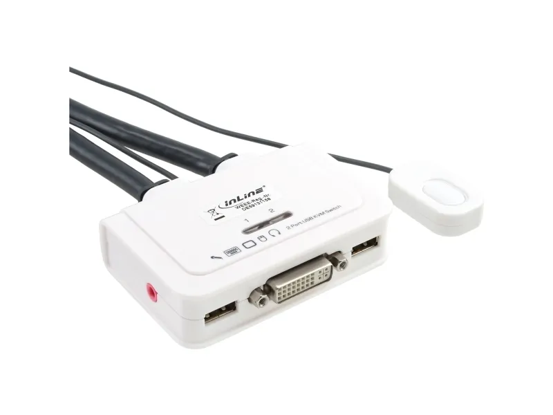 This device is a 2-port compact DVI USB "Cable KVM Switch" with 2 sets of fixed USB KVM & Audio/Mic combo cables and a wired QuickSwitch button for easy connection to your two computers. It allows you to access, control, boot and reboot two USB-enabled multimedia computers with only one USB keyboard, mouse, display and a speaker set and microphone. For easy and fast switching between two computers, you can use either keyboard hotkeys, the QuickSwitch button or the Switching Software Client installed on your PCs! QuickSwitch button for instant switching operation: The QuickSwitch button can be conveniently placed near your hand on the desktop. Whenever you need to switch computer channel, you can press it lightly for instant switching to the other computer. It is the most easy and fastest way to switch. The QuickSwitch button comes optionally either with a soft-magnet bottom to be readily attached to any metal surface, or with a Velcro sticker to be applied to any spot you like. Beside the QuickSwitch button, you can also use the keyboard hotkeys and software switching utility. Switching Software Support for PC and Mac: The device comes with both Windows and Mac version of the Switching Software utility program that can be installed on the connected computers to facilitate easy “software” switching. The Switching Software can show you the current active PC, and allows you to select PC as well as configure keyboard hotkeys. It appears as an icon on the system tray of your Window desktop, and will change its number icon upon switching to show the active computer port. With this software utility, it will give KVM users utmost convenience and control.