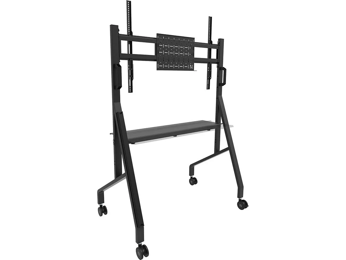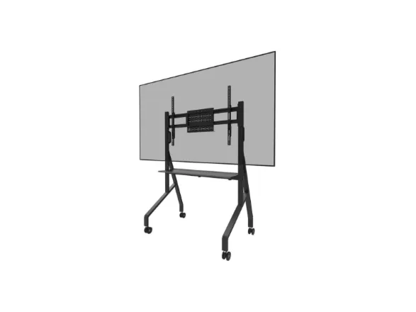 The Neomounts FL50-525BL1 MOVE Go is a mobile floor stand for flat screens up to 86" with a maximum weight capacity of 76kg. Due to the sturdy design and the included touch screen stabilizers, the MOVE Go is a perfect solution for touch screens. The floor stand is manually adjustable in 4 preset height positions, ranging from 106 to 136cm. The Neomounts MOVE Go is packed partially pre-assembled and installation can be done within just minutes. The trolley features practical handles and four solid 7.5cm double-locking caster wheels that allow you to move and use the floor stand wherever you like. Due to the large caster wheels, thresholds or carpets are no challenge to the FL50-525BL1. A multimedia shelf (front and back mountable) with a maximum weight capacity of 10kg and an AV hardware rack is included and optional for installation.